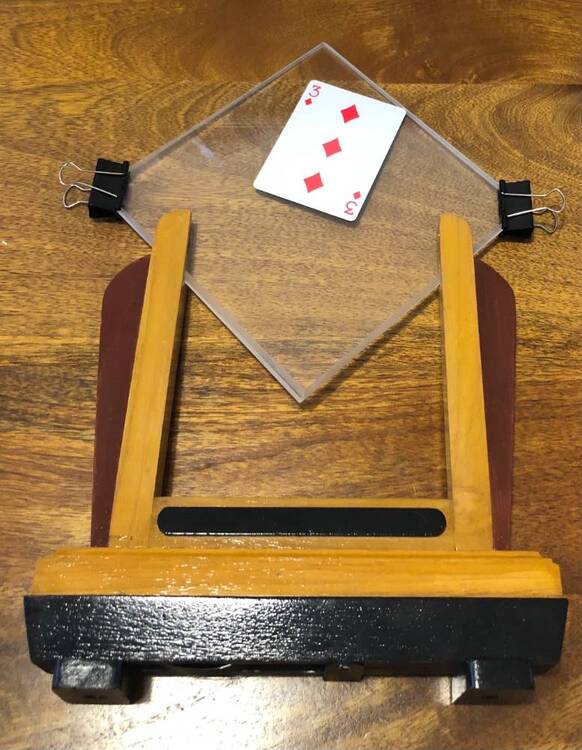 Prix: 50euros Livré Complet: Vitres, Cadre, Pinces, Carte double dos, boite de rangement Effet: Faites choisir librement une carte (que l'on peut donner à signer). Sur la table se trouve 2 plaques de plexiglas tenues à la verticale par un socle en bois. Propulser le jeu contre le plexiglas, la carte signée se retrouve entre les 2 plaques.