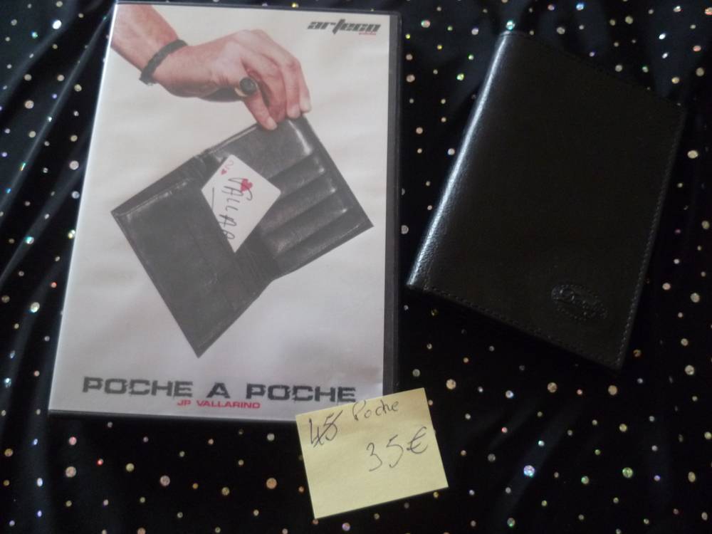 Poche A poche Vallarino neuf 45€ je le vend à 25€ fdp inclus Voici le seul effet de carte à la poche au monde SANS EMPALMAGE ! Vous avez certainement déjà vu ou même pratiqué ce fameux tour de la carte signée par le spectateur qui disparaît du paquet pour se retrouver dans une poche de votre portefeuille. Ce tour très apprécié du public nécessite de connaître une technique que tout le monde ne maîtrise pas forcément, celle de l’empalmage. Avec Poche à poche, que vous soyez débutant ou magicien professionnel vous allez réaliser cet effet très simplement et surtout d’une façon encore plus spectaculaire ! Imaginez : Un jeu de cartes est emprunté, puis donné à mélanger à un spectateur. Une carte est choisie au hasard, puis signée, par une autre personne du public. La carte est maintenant perdue dans le jeu que le magicien range dans l’étui, qu'il place ensuite dans la poche intérieure de sa veste. Il remonte ses manches et montre clairement ses deux mains vides. Il va à la poche arrière de son pantalon pour sortir le porte-feuille qui s’y trouve. J’insiste sur le fait que les mains du magicien sont vraiment vides, il n’y a aucune supercherie, ni gimmick qui aide à dissimuler la carte qu’il pourrait avoir en main. Le porte-feuille est remis au spectateur qui va lui même ouvrir la fermeture éclair du compartiment où l’on range habituellement sa monnaie pour en sortir une carte... celle qu’il a signée quelques instants plus tôt. Livré Complet : Portefeuille élégant noir, et le gimmick (et oui il y a quand même un gimmick). DVD explicatif Inclus Une Création de J-P Vallarino