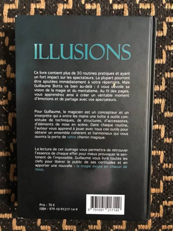 Bonjour je vend le livre « Illusion » de Guillaume Botta 60 euros Fdpi PayPal ou chèque…échange possible. Ce livre contient plus de 30 routines pratiques et ayant un fort impact sur les spectateurs. La plupart pourront être ajoutées immédiatement à votre répertoire. Mais Guillaume Botta va bien au-delà : il vous dévoile sa vision de la magie et du mentalisme. Au fil des pages, vous apprendrez ainsi à créer un véritable moment d’émotions et de partage avec vos spectateurs. Pour Guillaume, le magicien est un concepteur et un interprète qui a entre les mains une boîte à outils constituée de techniques, de structures, d’accessoires, d’éléments de mise en scène. Dans chaque routine, l’auteur vous apprend à jouer avec tous ces outils pour obtenir un ensemble cohérent et harmonieux qui vous ouvrira la porte de votre chemin magique. La lecture de cet ouvrage vous permettra de retrouver l’essence de chaque effet pour mieux provoquer le sentiment de l’impossible. Ce faisant, Guillaume vous livre toutes les clefs pour libérer le public de ses certitudes et en apporter une nouvelle : la magie existe en chacun de nous. Sommaire Préface de Carlos Vaquera Préambule : mon itinéraire magique Introduction Première partie : Réflexions pour développer la créativité La magie dans l’esprit profane Mentalisme ou illusion mentale ? La mélodie Goshman ou l’orchestre de la pensée L’impact visuel au service des illusions mentales Le principe caméléon Impact à retardement La notion d’impromptu La difficile frontière entre impossibilité et crédibilité Deuxième partie : Méthodes et stratégies Influences de l’effet Mystery card Méthodes pour contrôler treize cartes secrètement L’illusion du pickpocket Le » Peek sondage « Serial solution Le niveau d’impossibilité de l’ACAAN message-Hit Troisième partie : Les routines Chapitre 1 : Routines avec un jeu de cartes Routine 1 KO Incidence Routine 2 Folie de la pensée Routine 3 Open prédictions Routine 4 Deux pensées pour un regard Routine 5 ACAAN silencieux Routine 6 Trilogie impromptue Routine 7 Signed inception Routine 8 Kill Bill Routine 9 Réalités partagées Routine 10 Cluedo Enchaînement Chapitre 2 : Routines sans jeu de cartes Routine 11 Découvertes Routine 12 Politiquement incorrect Routine 13 La duplication du Sioux Routine 14 Des chiffres et des lettres Routine 15 Votre célébrité Routine 16 Le temps d’un rêve Routine 17 Opium Routine 18 Prédiction totale Routine 19 Le test du Taboo Routine 20 Taboo professionnel Routine 21 Para verbal Routine 22 Eyes and mind Bonus Transposition imaginaire Voyages en classe impossible Bidstery Clin d’oeil En guise de conclusion Remerciements Glossaire Caractéristiques du livre Format 16 x 24 cm 392 pages Plus de 320 illustrations Couverture rigide quadri Reliure couture Détails du livre Mise en pages et illustrations de Benoit Drager
