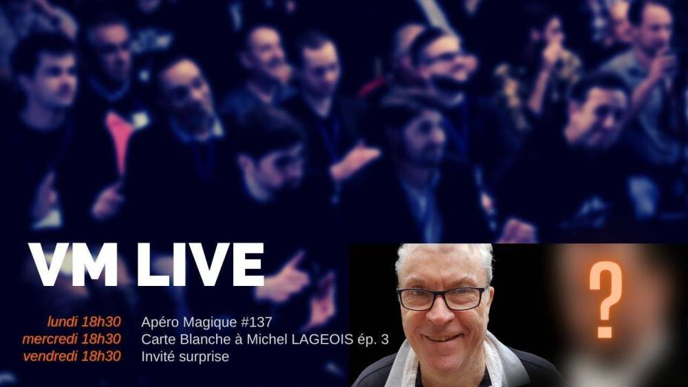 En direct le mercredi 11 janvier 2023 à partir de 18h30 S’il fallait résumer en deux mots cette soirée avec @Michel LAGEOIS : performance et générosité ! On connait son désir de faire partager sa passion et ses trouvailles, Michel a choisi de les faire connaître à ses collègues et de rendre ainsi à la Magie tout ce qu’elle a pu lui apporter, à commencer par la convivialité, les rencontres et la joie d’étonner un public. Après un premier épisode très apprécié, Michel sera présent chez moi pour vous faire découvrir ses nouvelles pépites. Comme à son habitude, Michel LAGEOIS sera très généreux en tours et créations. Book-test, coïncidence, dés, prédictions… 🖥 Pour retrouver tout de suite l’épisode 2 : https://virtualmagie.com/forum/topic/86597-vm-live-511-carte-blanche-à-michel-lageois-épisode-2 Accès aux directs PUBLICS & GRATUITS ici https://us02web.zoom.us/j/9322823734?pwd=b0Fua0NNTEZTcjhvUUNQOExtblpuZz09 Réunion Zoom : 9322823734 & mot de passe : VM Les After sont réservés aux membres du Cercle VM. 250 invités et 500 Replays + accès aux Afters Le savoir et l’expérience de Max MAVEN, Gaëtan BLOOM, Michael AMMAR, Armando LUCERO, Peter TURNER, Yann FRISCH, Bébel, Antonio, Boris WILD… chez vous ! Accède à tous les Replays, Afters & 500€ de cadeaux https://www.virtualmagie.com/blog/cercle-vm/ Vous pouvez désormais adhérer mensuellement ! Gaëtan BLOOM, Yannick CHRÉTIEN, Norbert FERRE, Ali NOUIRA, Arthur TIVOLI, Julien LOSA… font partie du Cercle VM. Et toi ? Rejoins la communauté ! https://www.virtualmagie.com/blog/cercle-vm/ -