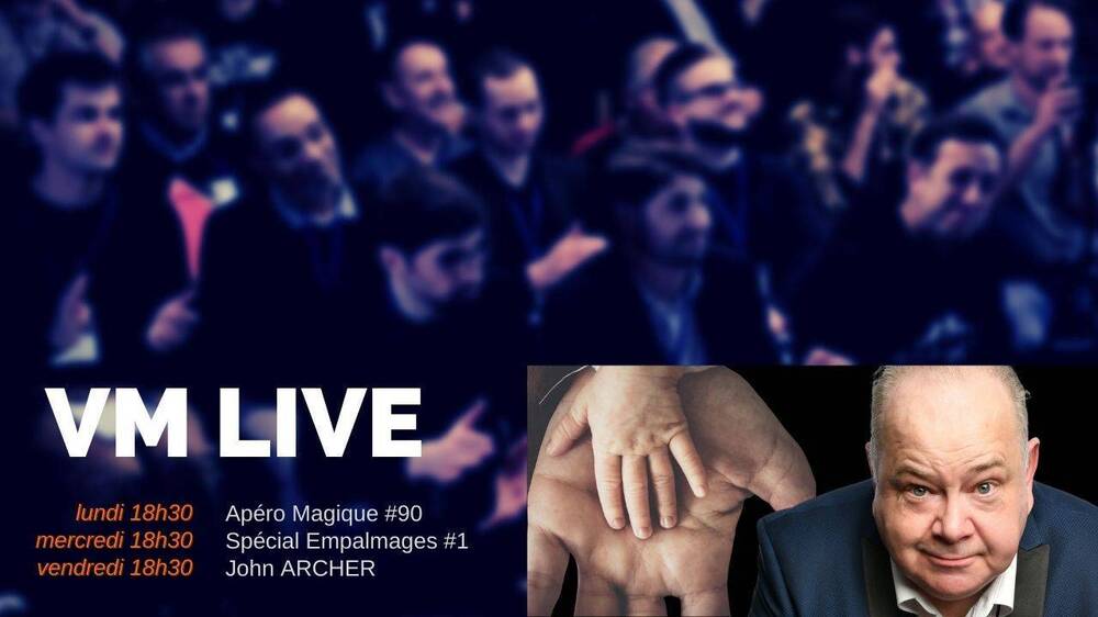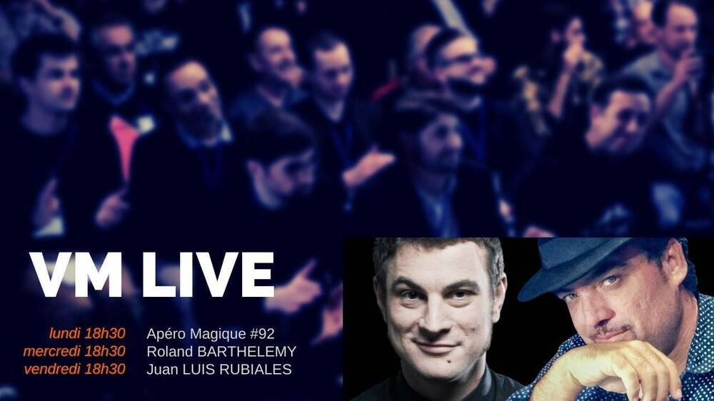 Voici le programme des VM Live de cette semaine en direct à 18h30 : ✔ lundi 14 février pour l’Apéro Magique #91 ✔mercredi 16 février avec @Roland BARTHELEMY ✔vendredi 18 février avec Juan Luis RUBIALES auteur du coffret Olé! [vmprod p=828] Les VM Live sont souvent suivis des l’After pour les explications des tours et des discussions jusqu’au bout de la nuit ! Accès aux directs PUBLICS & GRATUITS à 18h30 ici https://us02web.zoom.us/j/9322823734?pwd=b0Fua0NNTEZTcjhvUUNQOExtblpuZz09 Réunion Zoom : 9322823734 & mot de passe : VM Les After sont réservés aux membres du Cercle VM. 225 invités, 8 000 sujets abordés et 1 100 heures de Replays + accès aux Afters Le savoir et l’expérience de Max MAVEN, Gaëtan BLOOM, Michael AMMAR, Armando LUCERO, Peter TURNER, Yann FRISCH, Bébel, Antonio, Boris WILD… chez vous ! Accède à tous les Replays, Afters & 250€ de cadeaux Vous pouvez désormais adhérer mensuellement ! Gaëtan BLOOM, Yannick CHRÉTIEN, Norbert FERRE, Ali NOUIRA, Francis TABARY, Arthur TIVOLI, Julien LOSA… font partie du Cercle VM. Et toi ? Rejoins la communauté https://www.virtualmagie.com/blog/cercle-vm -