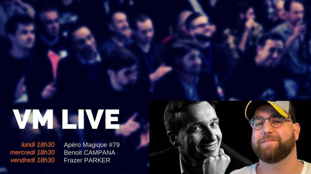 Voici le programme des VM Live de cette semaine : lundi 15 novembre à 18h30 pour l’Apéro Magique #79 @Philippe MOLINA sera avec nous pour présenter quelques tours ajoutés récemment à la boutique VM @Arthur TIVOLI pour sa chronique hebdomadaire, La Petite Histoire des Grands Magiciens. Il nous parlera de Sébastien MOTHES de la Cie Mozz aka @Docteur MOZZ et bien sûr, plein de tours présentés par Pierre, Riad, Théo et les autres, suivi à 20h30 de l’After pour les explications et encore + de tours mercredi 17 à 18h30 avec le mentaliste @Benoit CAMPANA, l’auteur du récent Mémoire(s) suivi ensuite de l’After pour toujours plus de tours et de bonne humeur vendredi 19 à 18h30 avec le mentaliste anglais Frazer PARKER suivi ensuite de l’After pour toujours plus de tours et de bonne humeur ?️ Accès aux directs OUVERTS à toute la communauté magique ici https://us02web.zoom.us/j/9322823734?pwd=b0Fua0NNTEZTcjhvUUNQOExtblpuZz09 Réunion Zoom : 9322823734 & mot de passe : VM ? L’After est réservée aux membres du Cercle VM. ? 210 invités, 8 000 sujets abordés et 1 000 heures de Replays + accès aux Afters Le savoir et l’expérience de Max MAVEN, Gaëtan BLOOM, Michael AMMAR, Armando LUCERO, Peter TURNER, Yann FRISCH, Bébel, Antonio, Boris WILD… chez vous ! ? Accède à tous les Replays, Afters & ? 250€ de cadeaux https://www.virtualmagie.com/cercle Vous pouvez désormais adhérer mensuellement ! Gaëtan BLOOM, Yannick CHRÉTIEN, Norbert FERRE, Ali NOUIRA, Francis TABARY, Arthur TIVOLI, Julien LOSA… font partie du Cercle VM. Et toi ? ? Rejoins la communauté https://www.virtualmagie.com/cercle -
