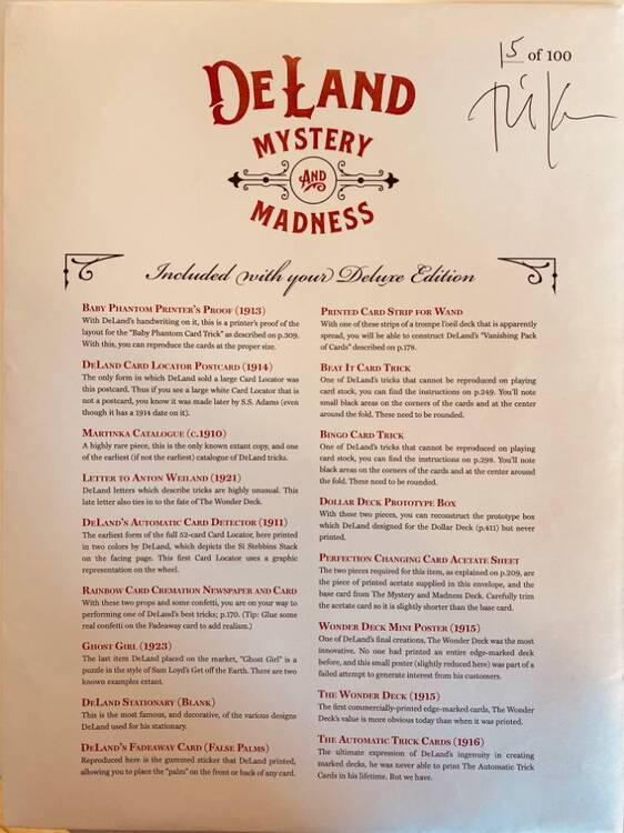 Pour cause de doublon, je vends l’édition COLLECTOR du livre sur DeLand (DeLand : Mystery & Madness), écrit et publié par Richard Kaufman et sorti en 2018. Cette édition, limitée à l’époque de la sortie à 100 exemplaires, est aujourd’hui introuvable. Il s’agit du numéro 15/100, signée par Richard Kaufman (voir photo). Le livre est en excellent état, quasi-neuf, en anglais, impression en couleur, 608 pages. Vous trouverez de nombreux comptes-rendus et vidéos de type « unboxing » vous montrant le contenu de ce livre massif et très riche. En plus du livre, l’édition collector contient les éléments suivants : - Une grande enveloppe, également signée et numérotée par Richard Kaufman (voir photo), contenant une série de documents, facsimilés et reproductions de lettres de DeLand, prototypes d’étui et de cartes truquées, etc. (voir photo) - L’enveloppe contient également une antiquité : un tour authentique de DeLand, avec les cartes et la notice vendues à l’époque : il s’agit ici des "Yogi Wonder Cards", une version du « Princess Card Trick ». Difficile de dater ces cartes avec précision, mais DeLand en a fait la publicité pour la première fois en 1907 dans The Sphinx. - Quatre jeux truqués (contre un seul dans l’édition normale), voir photos. Ce sont des re-créations de jeux conçus par Deland : 1- une reproduction du "Dollar Deck", son jeu le plus célèbre, marqué dans tous les sens 2- le "Wonder Deck" (jeu marqué sur la tranche) 3- le jeu « Automatic Trick Cards », un prototype que Deland n’avait jamais sorti à l’époque, véritable usine à gaz 4- et enfin un jeu de 54 cartes truquées en tous genres, imprimées par l’USPC (le seul jeu également vendu avec l’édition de base) permettant de réaliser certains des effets décrits dans le livre, en dos Bicycle Rider back, donc utilisables avec vos cartes habituelles. Les jeux sont ouverts, mais jamais utilisés. Prix : 240 euros pour l’ensemble + 20 euros de port en Colissimo avec numéro de suivi (le bestiau pèse de 4 kilos et sera bien protégé). Payable de préférence par Paypal.