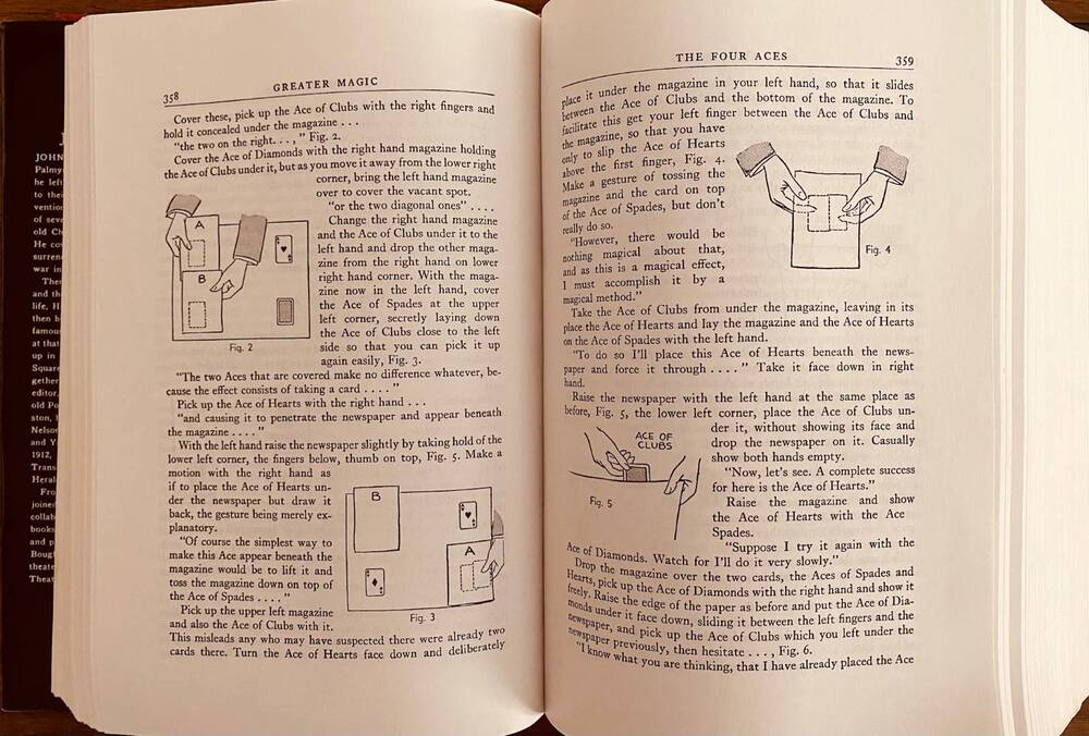 Je vends cet exemplaire de Greater Magic (J.N. Hilliard/Jean Hugard), réédité par Richard Kaufman en 1994, dans une version enrichie de plus de 300 pages supplémentaires, truffée de documents inédits, photos et effets non publiés dans la version originale. Cette édition est épuisée depuis longtemps. Si vous ne connaissez pas cet ouvrage : c’est l’un des classiques les plus importants écrits en langue anglaise. Publié originellement en 1938, c’est une sorte de « Tarbell en un seul volume » (plus de 1000 pages, le livre a le gabarit d’un Petit Larousse (ou d'une Bible, c'est selon). La très bonne idée de départ était de proposer un tour d’horizon complet de la magie de l’époque, dans toutes les catégories. On sortait alors des années 20-30, période extraordinairement riche et prolifique en magie de scène comme en close-up. Pour chaque chapitre, interviennent les experts reconnus de la discipline : cartomagie (de close-up et de scène) avec Vernon, foulards avec Tarbell, mentalisme avec Annemann, pièces, carré magique avec Royal Heath, cordes, anneaux chinois, liquides, cigarettes, grandes illusions, etc. La table des matières (révisée) fait 20 pages à elle seule. On y trouve la description de 715 effets (+ 100 pages d'effets dans la section bonus) et de méthodes oubliées (ou non), 1120 illustrations de Tarbell (qui manifestement en redemandait encore, alors qu'il sortait de l'écriture de son cours de magie par correspondance de 1200 pages), ainsi que des tours de Scarne, Rosini, Dai Vernon, Nelson Downs, Annemann, etc. Plus d'une centaine de magiciens ont collaboré au projet. La section bonus, écrite par Kaufman, spécifique à cette édition de 1994, est aussi intéressante que le livre en lui-même. Outre une centaine de pages d’effets supplémentaires non publiés dans l'édition originale, on y découvre aussi toute l’histoire et la genèse du livre, car derrière ce chantier de 7 ans, il y a eu de la volonté et des hommes, des événements dramatiques (la mort de Hilliard en plein milieu du projet), d’autres amusants (Annemann faisant le forcing pour reprendre l’écriture, c'est finalement Hugard qui rafle la mise) et une belle énergie commune, car chacun, voyant qu’il ne fallait pas passer à côté du projet, y est allé de sa contribution. Le livre marque quelques traces d’usure (il a bourlingué avec moi, dans plusieurs pays, pendant 20 ans), la jaquette (une reproduction de la jaquette originale de 1938) est marquée sur les tranches et par endroits, mais il n’y a aucune déchirure ou dommage particulier, hormis de multiples petites traces d’usage, car c’est un livre fait pour être lu... Je choisis de m’en séparer aujourd’hui car 1- j’aime bien l’idée qu’il vive une nouvelle vie en apprenant à quelqu’un d’autre autant qu’il m’a appris et 2- après des années de recherche, j’ai enfin trouvé une édition plus ancienne de ce livre, que je préfère désormais posséder. Je vois parfois cette édition de Kaufman vendue à des sommes astronomiques, mais je choisis de la vendre à un prix abordable, pratiquement le même qu’à sa sortie en 1994 (ajusté à l’inflation ;)... car j'aimerais qu'elle vive, plutôt que de finir dans une vitrine fermée à clé. Et comme ça va bien ensemble, je joins en plus un « prospectus publicitaire » original, daté de 1939 : un livret rare de 40 pages agrafées (voir photos) reprenant la table des matières, des photos et portraits des contributeurs (Vernon, Al Baker, Cardini…) et citations dithyrambiques de Thurston, Blackstone et autres stars de l’époque. C'est un livret original de l'époque, pas une reproduction. 135 euros pour le tout, port inclus (pas négligeable car le livre fait le poids d’une brique dorée) en France métropolitaine, payable par Paypal.