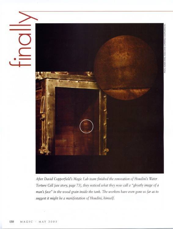 Hmm, Puisque Frantz se moque si bassement de moi, j'ai choisi de copier mot pour mot sa réponse (datée du 11 mai) dans le thread "Santo Subito" LE concernant, LUI.: Je cite " Oui... heu... Bon... humm... Voyons... Bah... C'est très gentil tout ça, merci beaucoup... C'est toujours très agréable de se sentir soutenu et de savoir que ce que l'on fait peut être apprécié..." Fin de citation. Je n'aurais pas mieux dit. Pour le reste, la magazine MAGIC explique bien, photos à l'appui, une partie du travail... Pour résumer l'article : le "Magic Lab" de DC travaille sur une multitude de choses à la fois, concernant le show en lui-même (la tournée ne s'arrête JAMAIS, il faut bien le comprendre - avec toute la logistique quotidienne que cela implique), les futurs effets et shows télés, et l'image de DC au sens très large - marketing, promotion, etc. Il travaille aussi sur la collection privée de DC et la restauration des appareils de collection qu'il possède au "Warehouse" de Las Vegas et chez lui à New York. Pour le coup, il s'agissait de réhabiliter la pagode chinoise de Houdini, c'est à dire le légendaire aquarium géant dans lequel Houdini était immergé la tête en bas. DC a racheté le vrai il y a quelques mois (pour une somme indécente), mais comme il avait été remis à neuf quelques années auparavant, DC a souhaité lui redonner l'aspect qu'il possèderait aujourd'hui s'il sortait tout droit du dernier show de Houdini, en 1926. Cela impliquait: comprendre comment cette chose marchait et se transportait à l'époque, pour pouvoir en recréer l'usure et la patine, enlever des centaines de vis et de pièces et remplacer le bois tout neuf par du bois d'origine... Tout ça au "Warehouse" de DC, en faisant en plus jusqu'à 4 shows par jour. Le resultat du processus est visible dans MAGIC. Au cours de la restauration (et c'est là où Frantz, cet hérétique, ne voit pas le miracle), le visage de Houdini a semblé apparaitre dans le bois, à l'intérieur de l'aquarium, façon visage de la Vierge dans le sandwich au fromage vendu sur ebay. MAGIC montre bien l'endroit sur une photo et il faut vraiment ne pas vouloir pour ne pas le voir... On sent le scientifique (réfractaire) qui sommeille en Frantz. S. -