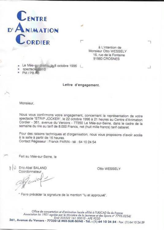 ah le bon vieux temps où l'on a touché une "vignette" - 29 FR je pense - et adieu à toute cette paperasserie kafkaienne.... Ou le bon vieux temps où l'on avait pu demander un "salaire net" et le client s'est débrouillé avec le reste. Nostalgiquement otto PS : voici deux contrats du siècle dernier, tout à fait legal à l'époque