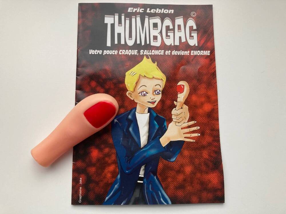 15 € - COMME NEUF - PORT EN SUIVI COMPRIS (France) - Paiement Paypal Prétextant un exercice d'assouplissement des doigts, le magicien tend son pouce à une spectatrice et lui demande de le bouger à fin de l'assouplir un peu. Tout à coup le pouce craque. Le magicien le regarde et tire dessus à l'aide de ses dents. Le pouce semble s'allonger d'une vingtaine de centimètres ! Il le remet en place mais cette fois-ci son pouce a triplé de volume Il souffle dessus avec insistance et le pouce retrouvera sa taille initiale. ➡ Dans notre répertoire, il y a des tours, effets ou gags que nous adorons présenter. Ils ont le pouvoir de nous mettre l'aise et en confiance, lorsque les mains moites et le cueur battant, nous entrons dans l'arène? Nous savons que la soirée ne sera pas tout i la fait la même si ces tours manquent à l'appel. C'est le cas de Thumbgag. Lorsque j'ai découvert cet accessoire, j'ai constaté son potentiel pour les magiciens. Ce qui m'a plus, c'est l'effet «cartoonesque » qu'il détient. Plutôt que d'utiliser cet accessoire tout bêtement après que le clown se soit coincé ou tapé le doigt, j'ai préféré composer une séquence de 3 phases me permettant d'amener avec plus de force l'effet final (le grossissement du pouce), pour en tirer un maximum d'impact. ➡ Tant en magie rapprochée que sur scène, Thumbgag trouvera sa place en apportant à votre numéro une touchesupplémentaire de magie et de rires. ➡ Vous recevrez : FP spécial inclus Livret de 15 pages en français, illustré de nombreux dessins explicatifs