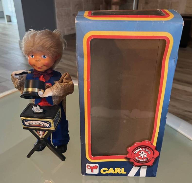Le petit magicien debout derrière son guéridon tient en main gauche un chapeau qu'il soulève et fait apparaître et disparaître successivement une colombe, un lapin et un bouquet de fleurs. Jouet mécanique (Mécanisme à ressort) en état de marche, en métal, plastique, avec habits d'origine. Tête en celluloïd. Carl, Allemagne de l'ouest (RFA), c.1970.