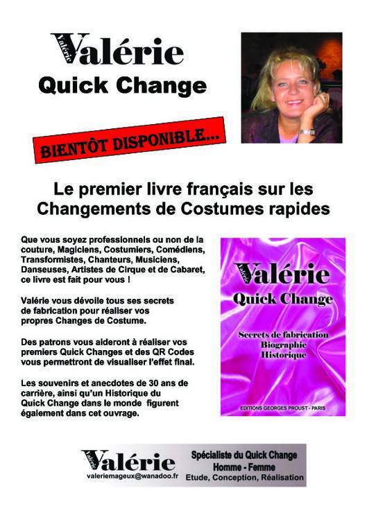 Le premier livre français sur les "Quick Changes"... Bio de Valérie... Tous les secrets de fabrication dévoilés avec dessins, patrons, liens vidéos, etc... Historique du Quick Change avant & après 1960 Parution prévue début septembre PS : L'article de Gérard KUNIAN est en ligne ici : http://www.virtualmagie.com/articles/critiques/lectures/valerie-quick-change-secrets-changements-de-costumes/ [vmprod p=10004]