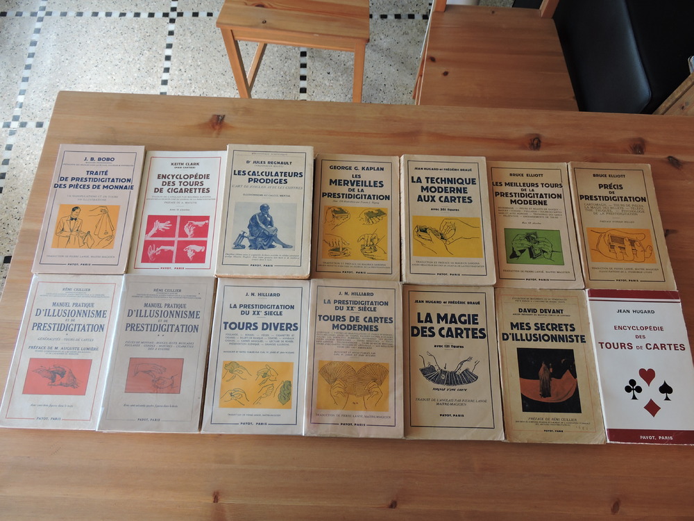 ATTENTION, pas sérieux S’ABSTENIR !!! Suite à un manque de sérieux de certains concernant les réservations, elles se font uniquement par règlement. Prochain passage en France entre le 5 et le 15 Juillet (Dates non arrêtées pour le moment). Lot indissociable !! Collection COMPLÈTE de la série PAYOT concernant la prestidigitation. 14 volumes !!! Impossible à trouver entière et dans cet état ! Pour ce lot : Paiement par virement bancaire uniquement ! Plus de photo pour des détails plus précis, sur simple demande en MP. Traité de Prestidigitation des pièces de monnaie J.B. Bobo 1956 510 illustrations, 116 manipulations et 236 tours 514 pages en parfait état. Encyclopédie des tours de cigarettes Keith Clark (Pier Cartier) 1958 31 planches 331 pages en parfait état. Les calculateurs prodiges. L’art de jongler les chiffres. Illusionnisme et calculs mental. Dr Jules Regnault (Professeur Magus) 1952 2ème édition revue et augmentée. 547 pages en très bon état. Les merveilles de la prestidigitation George G. Kaplan 1955 316 illustrations 322 pages en très bon état. Petits frottements sur le 1er plat, faux pli angle inferieur. La technique moderne aux cartes Jean Hugard et Frederic Braué 1955 351 figures 511 pages en très bon état, plats frottés. Les meilleurs tours de prestidigitation moderne. Micromagie – Pièces et billets de banque – Bagues – Cordes – Foulards – Tours de cartes sans et avec adresse – Tricherie des Grecs – Télépathie – Enchainement de tours Bruce Elliott 1957 68 planches 255 pages en très bon état, plats frottés, décoloration du au soleil, faux pli angle inferieur. Précis de prestidigitation Cartomagie – Tours de pièces, la magie des billets – Télépathie truquée – Psychologie de la prestidigitation Bruce Elliott 1952 247 pages en très bon état. Manuel pratique d’illusionnisme et de prestidigitation Tome I : Généralités - Tours de cartes Remi Ceillier (Professeur Boscar) 1960 103 figures 310 pages en très bon état. 1er plat moucheté. Manuel pratique d’illusionnisme et de prestidigitation Tome II : Pièces de monnaie – Boules, œufs, muscades, foulards - Cordes – Montres – Cigarettes – Dés à coudre. Remi Ceillier (Professeur Boscar) 1948 166 figures 383 pages en très bon état. La prestidigitation du XXème siècle Tome I : Tours divers Foulards – Boules – Pièces – Cigarettes et cigares – Billets de banque – Cordes –Anneaux chinois – Carrés magiques – Lecture de pensée – Prestation scénique. Grandes illusions J.N. Hilliard 1960 420 pages en très bon état. Traces d’humidités dans l’angle supérieur sur les 140 dernières pages (photos sur demande). N’altère nullement la lecture. La prestidigitation du XXème siècle Tome II : Tours de cartes modernes Eventails – Toutes les manipulations et passes modernes : faux mélanges, sauts de coupe, fausses coupes, forçages. Toutes les subtilités modernes supprimant les passes. Tours anciens modernisés. Tours improvisés. Tours sans adresse. Tours d’adresse. Tours de magie mentale. Tours avec cartes truquées et appareils. Les meilleurs tours des « as » américains J.N. Hilliard 1954 572 pages en parfait état. La magie des cartes Jean Hugard et Frederic Braué 1951 121 figures 2623 pages en très bon état. Mes secrets d’illusionniste David Devant 1949 61 gravures 266 pages en bon état. Plats frottés. Une étiquette 1.5-3cm collé au dos Encyclopédie des tours de cartes Jean Hugard 1970 434 pages en très bon état.