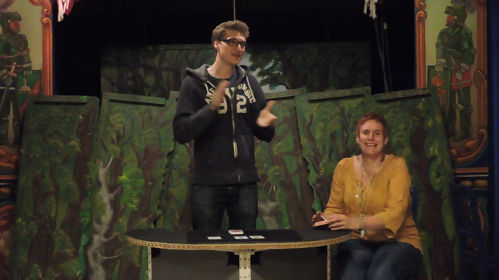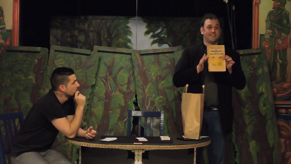 Au tour de Julian de nous épater ce soir avec une carte pensée, il aura besoin de l’aide de Quentin et Joseph ! Le jeu va être mélangé par Quentin. Une carte va être choisie et laissée sur la table. Julian va laisser tomber des cartes sur la table et quand il le souhaite Quentin pourra insérer sa carte. Joseph lui devra penser à une carte quelconque. Le jeu est maintenant étalé et Julian va l’apprendre par cœur en quelques secondes. Ensuite Joseph et Quentin vont inverser la position de leurs cartes et réunir le paquet. Julian étale de nouveau le jeu pour trouver quelles sont les cartes échangées … mais vu que c’est un fou !!! Il va le faire faces cachées. Et deviner la carte choisie ainsi que la carte pensée ! Il a failli passer par la fenêtre notre Julian. -