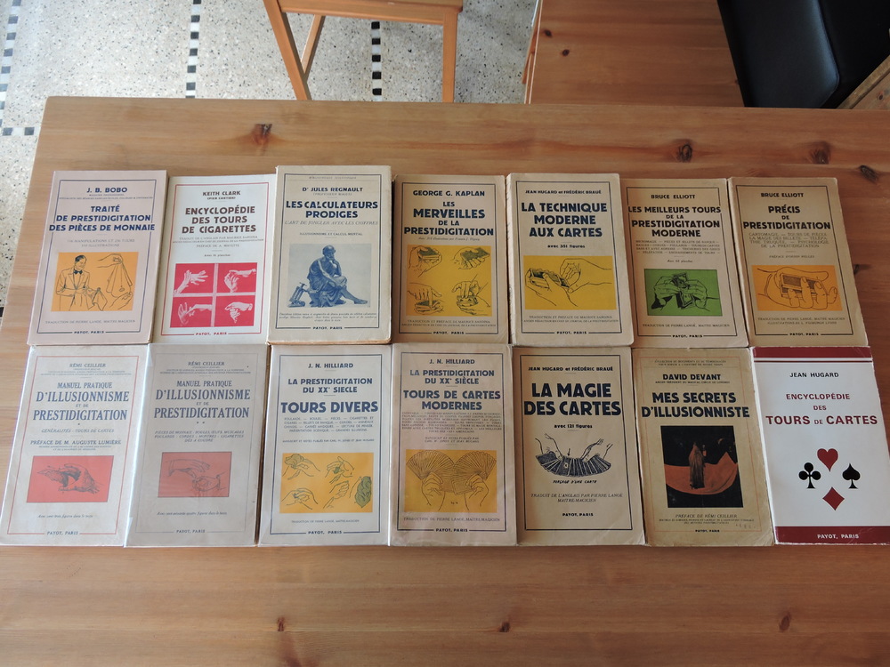 ATTENTION, pas sérieux S’ABSTENIR !!! Suite à un manque de sérieux de certains concernant les réservations, elles se font uniquement par règlement. Prochain passage en France durant la première quinzaine de Juillet (Dates non arrêtées pour le moment). Lot indissociable !! Collection COMPLÈTE de la série PAYOT concernant la prestidigitation. 14 volumes !!! Impossible à trouver entière et dans cet état ! Pour ce lot : Paiement par virement bancaire uniquement ! Plus de photo pour des détails plus précis, sur simple demande en MP. Traité de Prestidigitation des pièces de monnaie J.B. Bobo 1956 510 illustrations, 116 manipulations et 236 tours 514 pages en parfait état. Encyclopédie des tours de cigarettes Keith Clark (Pier Cartier) 1958 31 planches 331 pages en parfait état. Les calculateurs prodiges. L’art de jongler les chiffres. Illusionnisme et calculs mental. Dr Jules Regnault (Professeur Magus) 1952 2ème édition revue et augmentée. 547 pages en très bon état. Les merveilles de la prestidigitation George G. Kaplan 1955 316 illustrations 322 pages en très bon état. Petits frottements sur le 1er plat, faux pli angle inferieur. La technique moderne aux cartes Jean Hugard et Frederic Braué 1955 351 figures 511 pages en très bon état, plats frottés. Les meilleurs tours de prestidigitation moderne. Micromagie – Pièces et billets de banque – Bagues – Cordes – Foulards – Tours de cartes sans et avec adresse – Tricherie des Grecs – Télépathie – Enchainement de tours Bruce Elliott 1957 68 planches 255 pages en très bon état, plats frottés, décoloration du au soleil, faux pli angle inferieur. Précis de prestidigitation Cartomagie – Tours de pièces, la magie des billets – Télépathie truquée – Psychologie de la prestidigitation Bruce Elliott 1952 247 pages en très bon état. Manuel pratique d’illusionnisme et de prestidigitation Tome I : Généralités - Tours de cartes Remi Ceillier (Professeur Boscar) 1960 103 figures 310 pages en très bon état. 1er plat moucheté. Manuel pratique d’illusionnisme et de prestidigitation Tome II : Pièces de monnaie – Boules, œufs, muscades, foulards - Cordes – Montres – Cigarettes – Dés à coudre. Remi Ceillier (Professeur Boscar) 1948 166 figures 383 pages en très bon état. La prestidigitation du XXème siècle Tome I : Tours divers Foulards – Boules – Pièces – Cigarettes et cigares – Billets de banque – Cordes –Anneaux chinois – Carrés magiques – Lecture de pensée – Prestation scénique. Grandes illusions J.N. Hilliard 1960 420 pages en très bon état. Traces d’humidités dans l’angle supérieur sur les 140 dernières pages (photos sur demande). N’altère nullement la lecture. La prestidigitation du XXème siècle Tome II : Tours de cartes modernes Eventails – Toutes les manipulations et passes modernes : faux mélanges, sauts de coupe, fausses coupes, forçages. Toutes les subtilités modernes supprimant les passes. Tours anciens modernisés. Tours improvisés. Tours sans adresse. Tours d’adresse. Tours de magie mentale. Tours avec cartes truquées et appareils. Les meilleurs tours des « as » américains J.N. Hilliard 1954 572 pages en parfait état. La magie des cartes Jean Hugard et Frederic Braué 1951 121 figures 2623 pages en très bon état. Mes secrets d’illusionniste David Devant 1949 61 gravures 266 pages en bon état. Plats frottés. Une étiquette 1.5-3cm collé au dos Encyclopédie des tours de cartes Jean Hugard 1970 434 pages en très bon état.