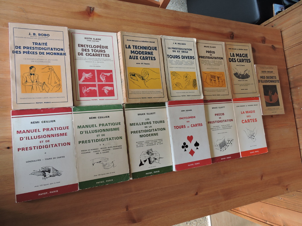 « La magie des cartes » Jean Hugard et Frederic Braué Editions Payot Ouvrage de référence et de collection 262 pages brochées 1951 1ere édition ! 65€ FDPI Prochain passage en France: Si votre règlement me parvient avant le mardi 21 février je sais le poster en France lors de mon passage le mercredi 22 février 2017 Règlement: Virement, Chèque, Paypal (Paiement à un ami, frais Paypal à votre charge). Préface de Paul Fleming 121 figures de Frank Rigney Traduit par Pierre Lanoe En bon état (cf photo), décoloration sur le 1er plat (due au soleil). Le dos a été fendu sur la largeur et recollé proprement (cf photo). On a rien inventé !!! Tout ce qui vous intéresse en prestidigitation se trouve dans les Payots !!! C’est une collection indispensable à tout magicien. Toutes les techniques de bases y sont expliquées en long en large et en travers. Les principes utilisés, les tours récents, ne sont que des principes ou des tours réactualisés à notre époque Le mélange usuel et ses usages Le mélange a la queue d’aronde Fioritures La carte glissée La carte a l’œil La carte clef L’empalmage La carte coulée Le mélange usuel II Faux mélanges et fausses coupes La levée double et le retournement Le saut de coupe Fioritures diverses Les renversements Le mélange hindou et autres contrôles La carte forcée Les filages dessus et dessous Arrangements Enchainements Tours de scène -