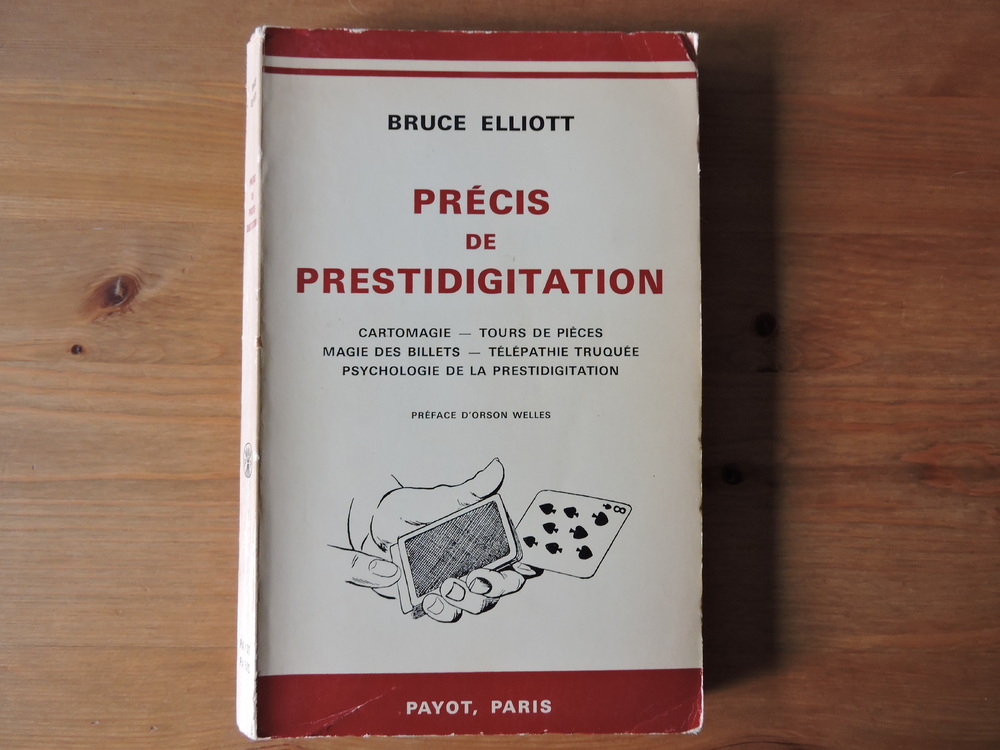 « Précis de prestidigitation » Bruce Elliott Editions Payot Ouvrage de référence et de collection 247 pages brochées 1970 55€ FDPI Prochain passage en France: Si votre règlement me parvient avant le mardi 21 février je sais le poster en France lors de mon passage le mercredi 22 février 2017 Règlement: Virement, Chèque, Paypal (Paiement à un ami, frais Paypal à votre charge). Préface d’Orson Welles Traduit par Pierre Lanoe En bon état (cf photo), les plats sont légèrement frottés, présence de deux tampons sur la 1ere page (cf photo) On a rien inventé !!! Tout ce qui vous intéresse en prestidigitation se trouve dans les Payots !!! C’est une collection indispensable à tout magicien. Toutes les techniques de bases y sont expliquées en long en large et en travers. Les principes utilisés, les tours récents, ne sont que des principes ou des tours réactualisés à notre époque Agréable simplicité Cartomagie simple sans jeux et cartes préparées Cartomagie simple avec jeux et carets préparées Choix de tours d’exécution rapides Tours de pièce de monnaie Les énigmes d’Elliott La magie des billets Télépathie ??? Les ardoises spirites Le vrai secret dévoilé Appendice -
