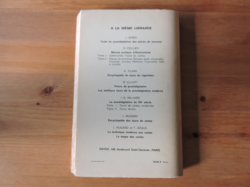 «La prestidigitation du XXe siècle , Tours Divers» John Northern Hilliard Editions Payot Ouvrages de collection 1960 65€ FDPI Prochain passage en France: Si votre règlement me parvient avant le mardi 21 février je sais le poster en France lors de mon passage le mercredi 22 février 2017 Règlement: Virement, Chèque, Paypal (Paiement à un ami, frais Paypal à votre charge). Tome I : Tours divers 420 pages brochées Traduction Pierre Lanoe Illustration d’Harlan Tarbell En bon état (cf photo), les plats sont légèrement frottés, coiffe et mors légèrement usées. Quelques pages(5 ou 6) ont été mal coupées (cf photo) On a rien inventé !!! Tout ce qui vous intéresse en prestidigitation se trouve dans les Payots !!! C’est une collection indispensable à tout magicien. Toutes les techniques de bases y sont expliquées en long en large et en travers. Les principes utilisés, les tours récents, ne sont que des principes ou des tours réactualisés à notre époque. Voici les principales informations des tables des matières. Tome I : Foulards Boules Pièces Cigarettes et cigares Billets de banques Cordes Anneaux chinois Carrés magiques Lecture de pensée Présentation scénique Grandes illusions -