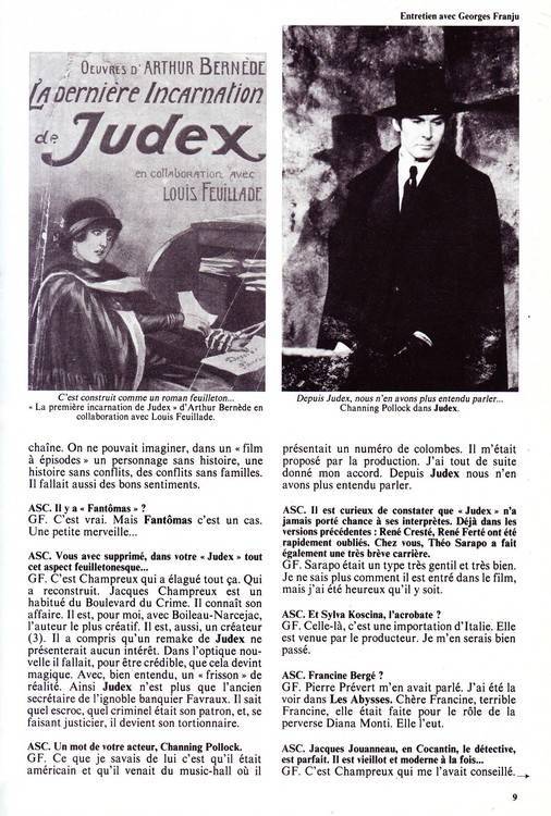 Judex de Franju, longtemps introuvable, est désormais dispo en DVD. Il faut en profiter ça va peut-être pas durer... http://www.amazon.fr/films-Georges-Franju-JUDEX-ROUGES/dp/B0052N2B5C/ref=sr_1_1?ie=UTF8&qid=1414353617&sr=8-1&keywords=judex+Franju Sinon pour la revue, ça vaut le coup de se la procurer (sur priceminister pas exemple) car il y a tous le texte des deux films suivants de Franju : Judex et Le Grand Méliès. -