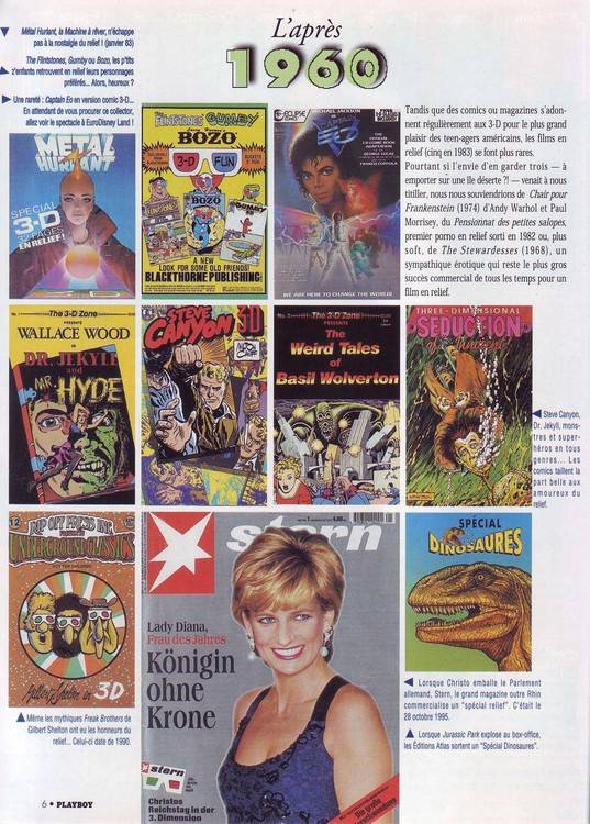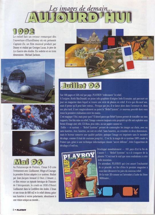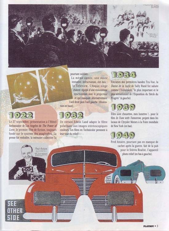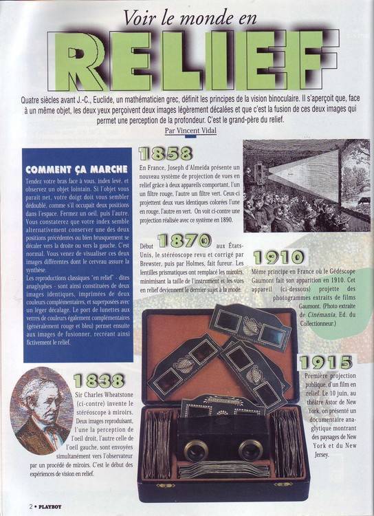 Ils avaient sorti en 1996 un numéro de Playboy en relief mais avec des photos normales (pas de flou classique) que l'on voyait en relief grace à des lunettes spéciales. Dans ce numéro il y avait un article sur l'historique des images en relief, le voici :