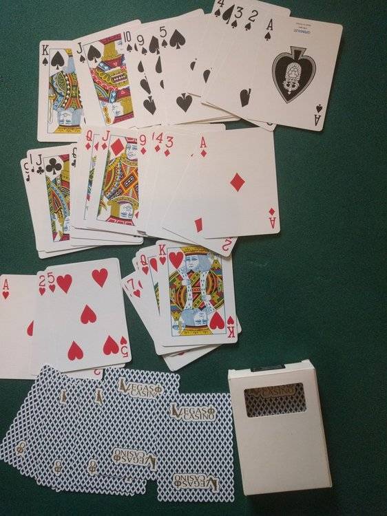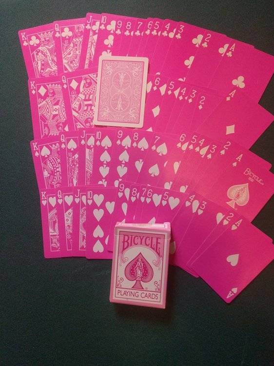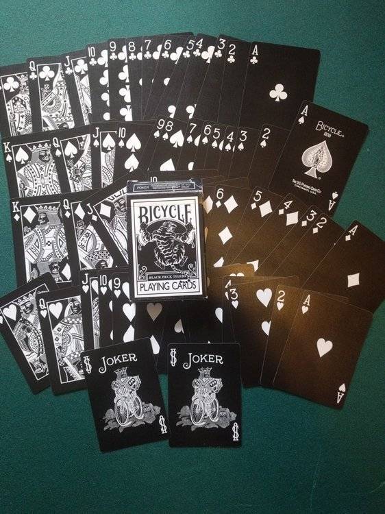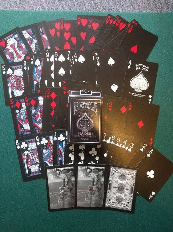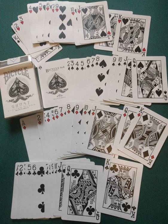 Jeux tous ouverts mais en très bon état (pratiquement jamais servi) Vendu 20€ FDPI (mondial relay) 1 jeu Bicycle GHOST playing cards www.ellusionist.com (dos et faces blanche sauf points couleur rouge) pas de joker (neuf ~8$) 1 jeu Bicycle black deck tigers (dos blanc bordure noire/ faces fond noir, symbole blanc) 2 jockers (neuf ~20$) 1 jeu bicycle Raider noire (dos noir, faces noir, point rouge pour coeur/carreaux et blanc pique/trèfle) 2 jockers + 1 double face (neuf ~5$) 1 jeu bicycle pink pastel raider back (dos rose, faces fond rose, lettres blanches) pas de joker (neuf ~8$) 1 jeu bicycle blue pastel raider back (dos bleu clair, faces fond bleu, lettres blanches) 1 joker (neuf ~4$) en cadeau 1 jeu Las vegas casino bleu grimaud pas de joker