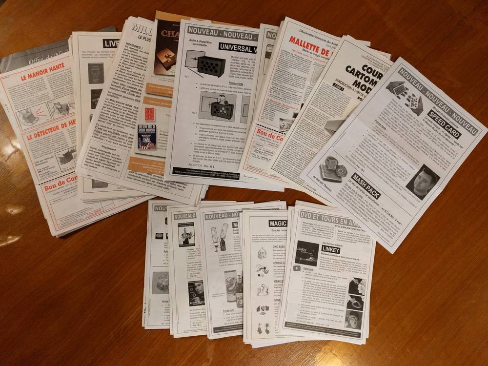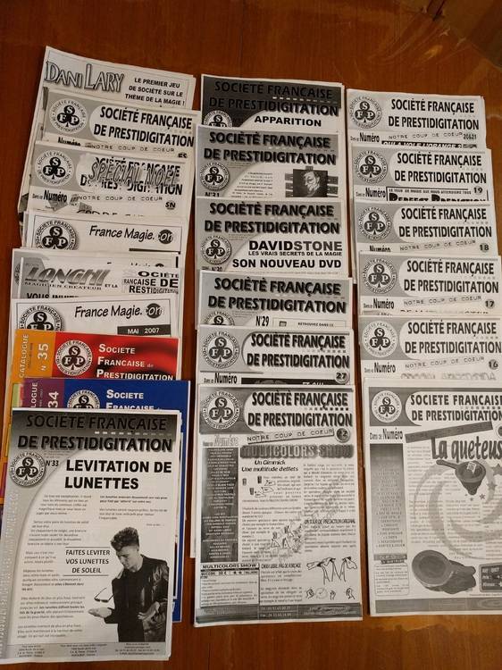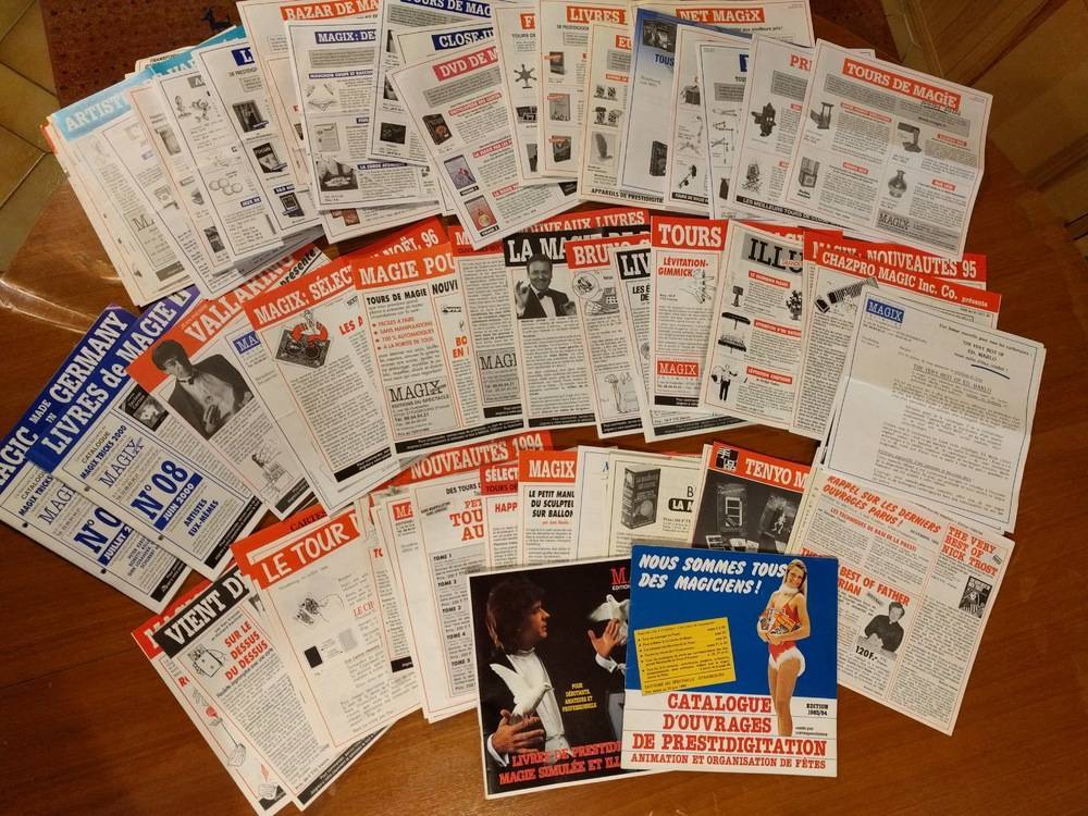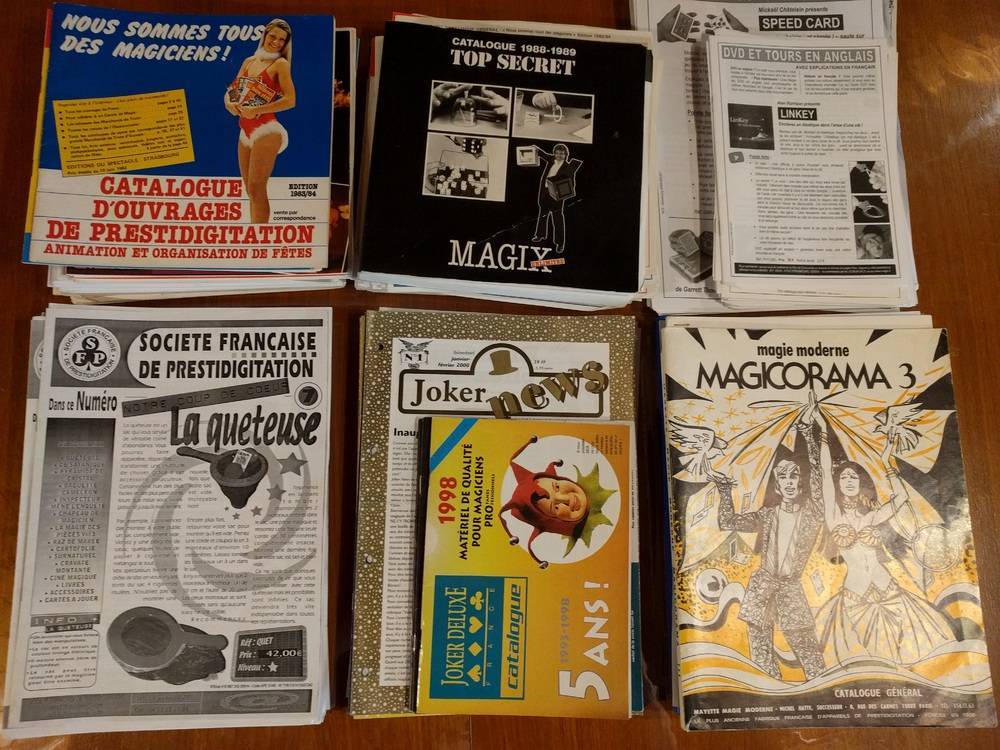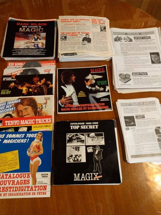 Bonjour je vends pour cause manque de place, mes catalogues des boutiques de magie (voir photos) Petit prix pour l'ensemble, à négocier. MAGIX depuis 1983 jusqu’à 2013 (avec le catalogue top secret de1988-89 156 pages) MAYETTE depuis 1992-2000 + divers Magicorama 3 /bibliomagie 19/83 + tarifs + presti printemps 79 JOKER depuis N°1 février 2000 jusqu'au N°16 2002 + divers SFP N° 7,1617,18,19,20&21,22,27,29,30,31,32,33,34,35,+divers RAIMONI Catalogue bibliomagique Française 1993, 256 pages
