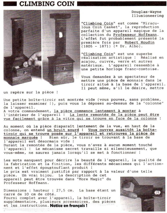 -Très facile à faire en close-up ou magie de salon. -Livré complet avec la notice en français. -Une pure merveille de mécanique. -Fonctionnement à vie ! Pas d’électronique !! -État neuf. PRIX : 430 euros Le prix comprend le port pour la France métropolitaine en collismo suivi contre signature. -