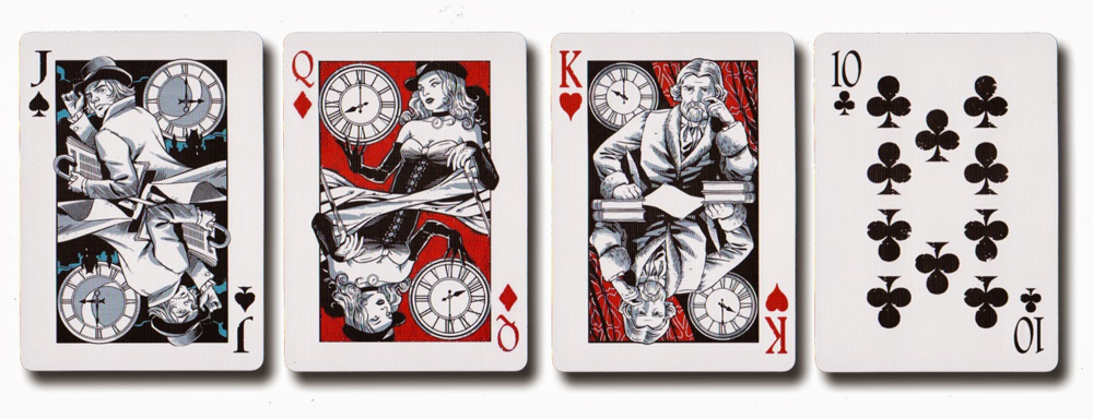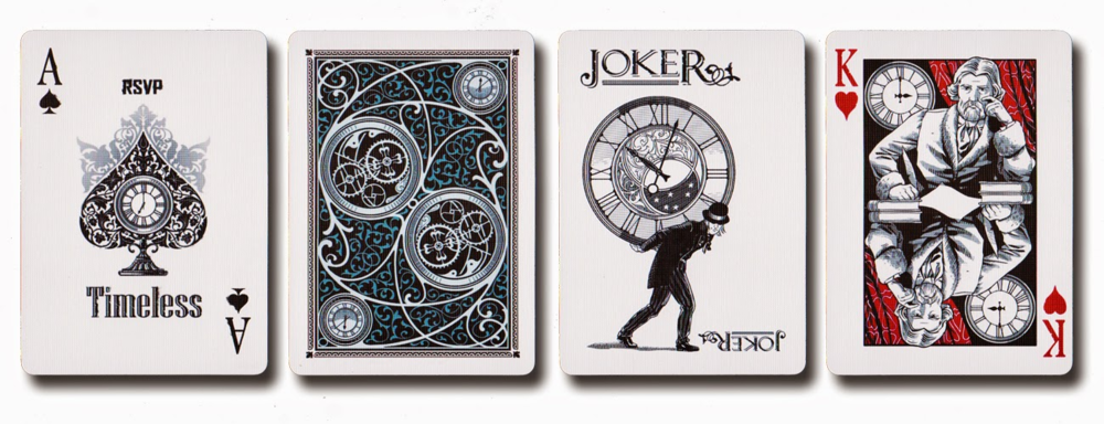 Salut à tous ! Je recherche un paquet de cartes format poker dont les dos (et éventuellement, dans un monde parfait, les faces) évoquerait (de près ou de loin) le thème du temps. J'ai cherché sur XCM, cartesmagie et LPM. Les symboles du temps étant des motifs symétriques (sablier) ou circulaires (cadran d'horloge), je m'attendais à en trouver plein, mais la récolte est plutôt maigre Jusqu'ici, j'ai trouvé les jeux suivants : Timeless deck Jusqu'ici, le plus proche de ce que je cherche... Dr Jekyll deck & Mr Hyde deck Bon, y a un cadran de Big Ben au dos, mais le jeu est un peu trop typé pour ce que je veux en faire Donc si vous avez des références de cartes dans ce thème, ou simplement des sites où je serais susceptible d'en trouver, je suis preneur...