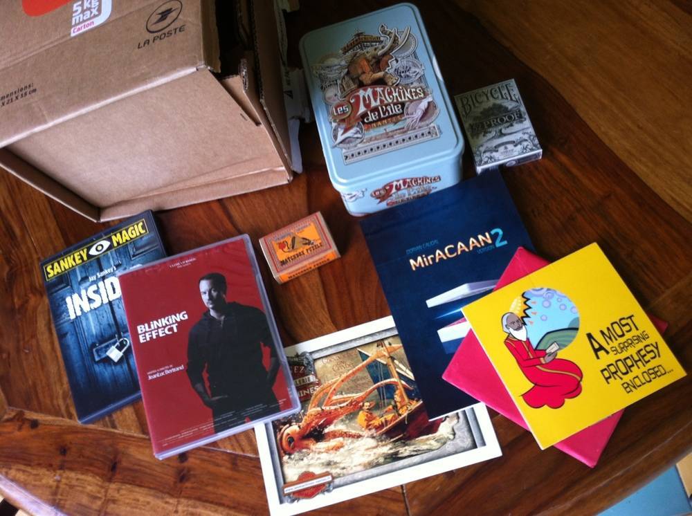 J’ai déjà eu la chance de rencontrer Friboudi, docteur en neurosciences si je ne m’abuse, c’était lors du spectacle de Benoît Rosemont en octobre 2011 si je ne m’abuse encore plus. Et puis même qu'il y avait Tabary et quelques autres ce soir-là, et on a discuté dans le bar pas loin du théâtre, en after. Na. Bref, il y a un lustre, qui aurait pu penser que j’allais devenir son « swappé » et recevoir un joli colis de sa part ? Je ne suis pas un pro de la vidéo donc j’insère ci-dessous une photo. Description rapide du contenu : Un casse-tête intitulé Bermuda Triangle, c’est drôle vu que j’ai moi-même publié dans un numéro d’Imagik un tour du nom de Triangle des Bermudes ! « Hasard, coïncidence ? … Je n’crois pas… » Un DVD, Insider de Jay Sankey (« Sans key », sans clé ! C’est drôle car il y a un cadenas sur la jaquette). J’adore Sankey et justement je n’ai pas ce DVD, ça tombe plutôt bien. « Hasard, coïncidence ? … Je n’crois pas… » En tout cas il semble y avoir un truc magnétique puissant là-dedans qui fait que tous les objets ferreux aux alentours se collent sur le DVD, je ne le trouve plus sous cette montagne de métal, au secours ! Blinking Effect de Jean-Luc Bertrand. Super, je comptais justement l’acquérir (et non l’aguerrir, car ça n’aurait aucun sens). « Hasard, coïncidence ? … Je n’crois pas… » Pour les papilles et le ventre (mais aussi pour le plaisir des yeux car la boîte est superbe) des palets nantais et des galettes avec dans le titre une contrepèterie non grivoise qui donne « Les malines d’Eschyle ». « Hasard, coïncidence ? … Je n’crois pas… » (Bon sang, la boîte de biscuits vient de se coller sur le DVD de Sankey, avec le casse-tête Bermuda et son anneau métallique.) Un jeu de cartes 52 proof (52 preuves « de quoi », je ne sais pas). Bel étui sur lequel figure un arbre qui évoque le saule cogneur d’Harry Potter mais avec ses feuilles (l’arbre, pas Harry). Je n’ai pas ce jeu, ça tombe vraiment bien ! « Hasard, coïncidence ? … Je n’crois pas… » Il ne me manque plus que cinquante et un autres jeux et je fais mon propre Rainbow Deck… Yeah ! Bon, il me reste deux ou trois trucs qui ne sont pas attirés par l’aimant du DVD Insider, notamment la carte pop-up Surprising Prophesy. J’avais vu ce truc dans VM il me semble, j’ai d’ailleurs dans mon bazar une pochette façon cuir qui permet l’effet (disons qu’une carte patience peut se retrouver à l’intérieur de la pochette, donc dans un endroit « impossible » idéal pour une prédiction) mais là, produire la prédiction de la carte pop-up avec un fakir auto-dépliant tenant une enveloppe et tout et tout, c’est encore plus sympa ! « Hasard, coïncidence ? … Je n’crois pas… » Une carte personnelle avec quelques mots gentils, merci Dorian. Et le livre MirACAAN 2 qu’il fallait que je me procure, du coup c’est fait (et comme je viens d’acheter du pain, ça me fait une paire de choses faites). Il s’agit de la version de Friboudi himself du graal du cartomane, et dédicacé en plus ! Merci encore Fribou (je peux t’appeler par ton petit nom hein ?) et merci également à Radlabo tant pour l’initiative du swap que pour l’intendance. Christian -