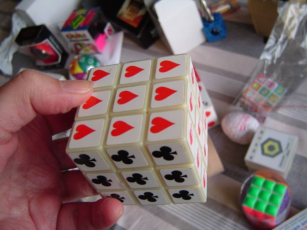 Bon, je reviens du congrès, je fais un topo rapide (désolé pour le pléonasme, un « topo » c’est bref par nature, ok). Ambiance : des gus de partout en train de manipuler des cubes de toutes sortes, à une vitesse souvent démentielle, c’est toujours impressionnant d’être confronté à de grands malades, les Dan & Dave du casse-tête. Je suis heureux de constater qu’il n’y a pas que des mecs (mais les plus malades, ce sont les mecs, sans hésitation aucune ). Des stands avec de belles pièces à vendre (enfin, celles qui restent après la razzia des acheteurs de la veille) et des horreurs (normal, il en faut pour tous les budgets, mais aussi pour les amateurs d’horreurs, comme moi ), des concours assez variés, la mise à disposition de cubes « custom » très originaux (dont ceux, formidables !, de l’organisateur Jean-Louis Mathieu auquel je faisais référence plus haut), … Ce qui m’a le plus fasciné : le concours de Rubik’s Cube en aveugle . Certains tentent de mémoriser jusqu’à sept cubes mélangés et les résolvent tous à la suite avec un bandeau sur les yeux (de surcroit, un membre de l’équipe organisatrice tient une feuille de papier devant leur visage pour faire écran, au cas où). Je profite de l’occasion pour aller discuter avec un jeune homme qui vient de réussir à en résoudre cinq ou six en quelques minutes. Il m’explique sa façon de mémoriser les cubes et les stratégies mentales dont il use pour « jouer » avec ses cubes en aveugle. Sa méthode lui permet de résoudre les cubes non pas l’un après l’autre mais en travaillant simultanément sur chaque cube selon une logique de mémorisation des arrêtes qu’il me détaille. Je déniche un cube avec des trèfles, des cœurs, des piques, des carreaux… Sentimental comme je suis , je « craque » et j’en profite pour acquérir deux ou trois bricoles. Mon coup de cœur : un coffret à l’allure de livre relié qui contient toutes les pièces d’un 4X4X4 disséqué tel un écorché. L’objet est censé être un kit de construction, mais à l’évidence il restera en l’état, jamais construit, un cube virtuel. Tout ce que j’aime… Je suppose que le Rubik’s French Open est un mini congrès qui va perdurer. L’entrée est gratuite, c’est appréciable. À l’année prochaine ! C. G. -
