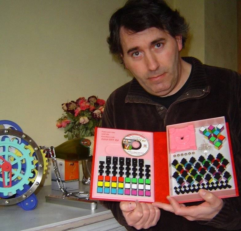 Le fameux cube a connu ces dernières années des extensions formidables. Le monde des céphaloclastophiles, débordant d’imagination, a connu des révolutions technologiques, par exemple le V-Cube 7 de Panagiotis Verdes, dont j’avais consulté les plans dès les premières maquettes avant commercialisation, qui est un trésor d’ingéniosité (pour des raisons structurelles, les faces sont arrondies ; le Rubik’s Cube traditionnel avait des limites qui nécessitaient un changement conceptuel pour résoudre des problèmes mécaniques, ce qu’a fait Verdes), ou encore le Void Cube (sans cubes centraux !), etc. En compagnie de deux bons amis amateurs de casse-tête, j’ai eu l’occasion de passer toute une journée très sympa avec l’un des grands spécialistes français du Rubik’s Cube qui m’a montré de fabuleuses créations (notamment des cubes dont on doit résoudre non seulement les faces externes mais également l’intérieur accessible par des découpes à rendre fou !) ; il est également l’organisateur du RUBIK'S French Open 2009 (oui oui, en anglais dans le texte !). Voici quelques renseignements relatifs à cet événement qui a lieu ce week-end à l'hôtel Elysée près du parc Disneyland. RUBIK'S French Open 2009 Concours de mosaïques de cubes V-Cube 6 V-Cube 7 Void Cube Christian Girard -