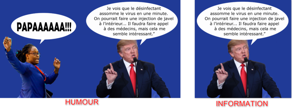 A toute fin utile néanmoins, la frontière est tellement mince qu'il me paraît judicieux de rappeler que: (à ceci près qu'il faudrait remplacer "javel" par "désinfectant") Cette séquence est vraiment à voir tant ça paraît incroyable: Le contrechamps pourrait être amusant s'il ne donnait pas à pleurer: Bon, là où il n'y pas tort c'est que si on s'enfile un litre de désinfectant, effectivement il y a de fortes qu'on ne meure pas du covid... Savant dosage d'Idiocratie et de Darwinisme. -