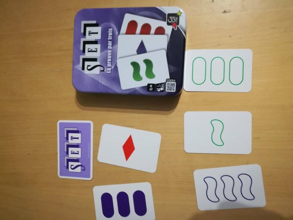 Je voulais vous partager un jeu qui me plaît à plus d'un titre. Il s'agit de set. Le jeu en lui même est intéressant même un enfant peut y jouer et gagner. On peut y jouer à plusieurs ou en solo. Le but est trouver le plus rapidement un set de 3 cartes qui obéissent à des règles précises. Les cartes représente des symbole qui peuvent faire penser au symbole ESP. D'un point de vue mathématique il y a aussi des particularités surprenante. 3 formes. 3 couleurs. 3 quantités. 3 remplissages. 81 cartes et aucune identiques. Sur 12 cartes prises au hasard il y a 1 probabilité sur 33 qu.il n'y ait aucun set.