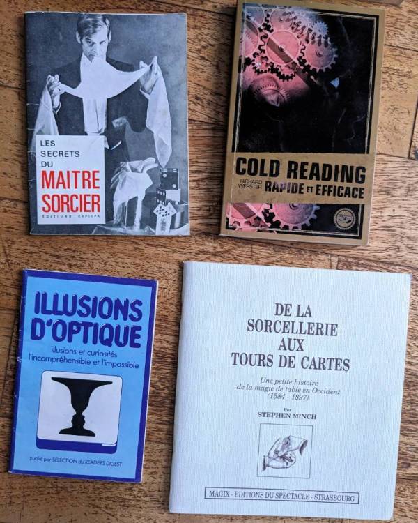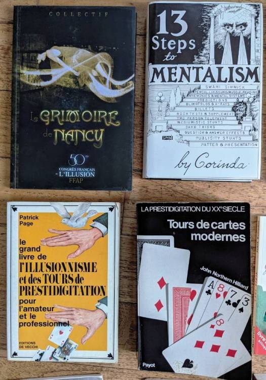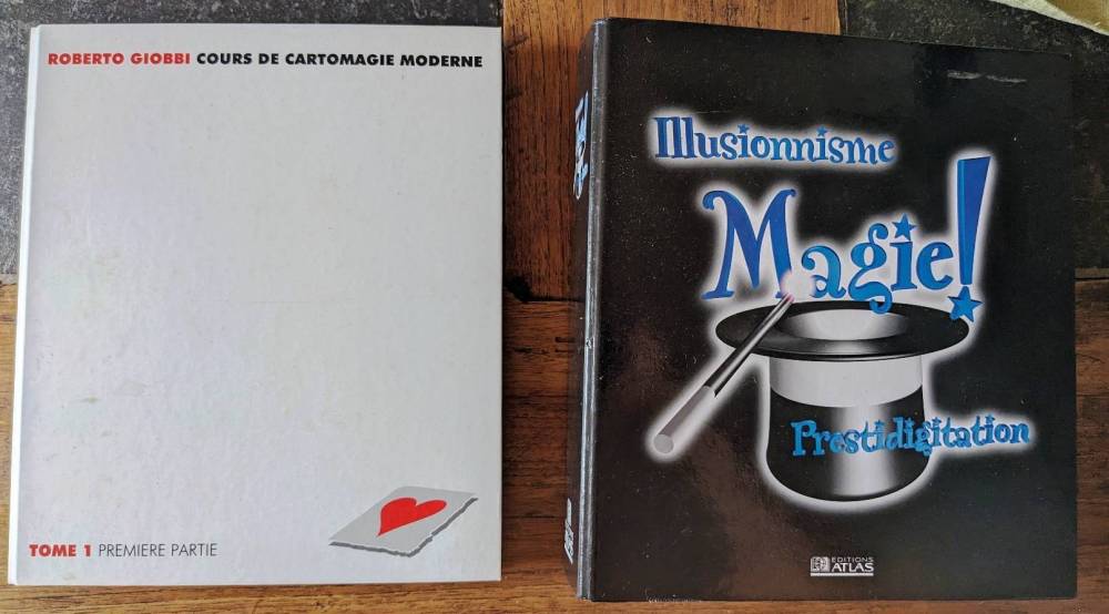 Je rajoute deux classeurs: Cours de Cartomagie Moderne Tome 1 première partie de Roberto Giobbi, stocké en pièce humide donc pas en état neuf. Fiches Atlas, doit manquer quelques fiches mais pratiquement complet. Le lot de 14 livres/livrets/classeurs 40 euros + le port.