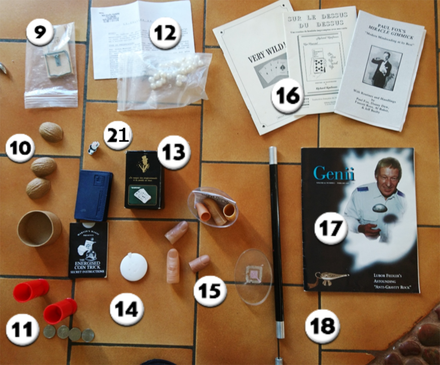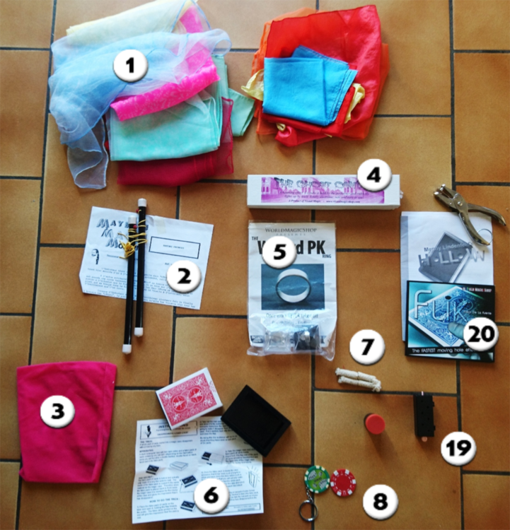 Faites votre choix, ne payez que les frais de port (6 euros en suivi), je vous envoie les articles choisis à la fin du confinement. Les articles ne sont pas forcément en super état, parfois sans explication (un coup de fil ou un MP si besoin). Je privilégie les envois multiples, 100% de remise sur le lot complet... 1- Foulards divers 2- Bâtons chinois Duvivier 3- Sac à la savonnette sans savonnette 4- The Ghost Candle 5- PK ring taille inconnue 6- Disappearing card case 7- 4 aimants à corde 8- Jetons de poker aimantés dont 1 en porte clefs 8- 1 piège à souris pour tour de cartes, sans explication 9- 3 coquilles de noix en plastique pour bonneteau 10- Flying coins tricks + 4 pièces de 1 francs 11- The energized coin trick 12- Le collier de perles de Vadini 13- Suspens (tour de cartes type Card-Toon de Dan Harlan) 14- 1 squizzer 15- Des faux pouces tailles diverses 16- 3 booklets d'explication sans gimmick, dont un sur une houlette impromptue (donc pas de gimmick...) 17- 1 magazine GENII 18- 1 baguette à disparition de foulard sans explication 19- 2 petits tours matos en plastique mais sympathiques (Spéciale dédicace to EFB) 20- Flick avec carte + Hollow juste notice (sans la perforatrice...) 21- Un pins chapeau + cartes