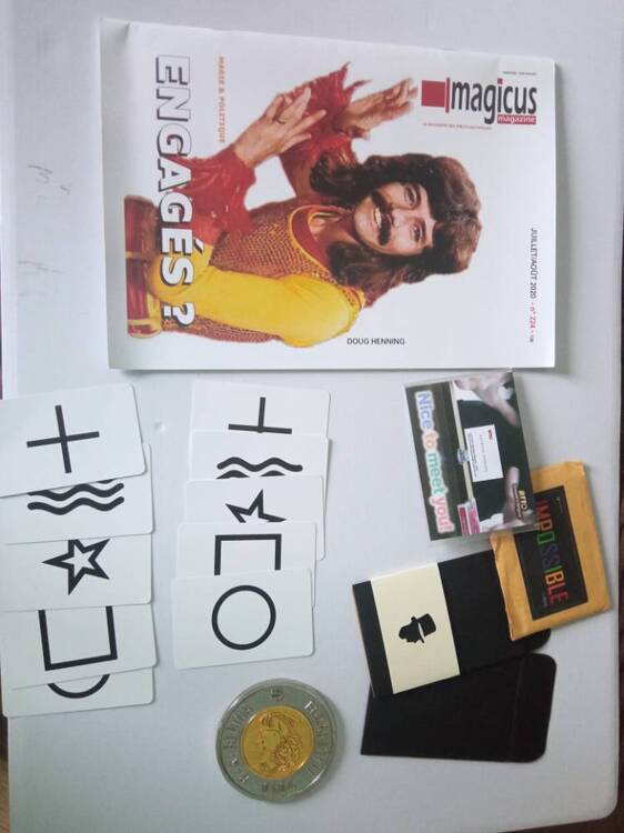 Bonjour je vends ce superbe lot d'occasion à prix imbattable livraison incluse en suivi. -Nice to meet you de masuda ( 2 cartes d'entraînements utilisé ( j'ai écrit dessus , il vous explique comment faire votre gimmick avec votre propre carte de visite en moins de 10 secondes ...) - 2 enveloppes neuves double sortie de Handcraft Manufacturer ( neuve !) -Impossible by Hank ( Carte utilisé à l'entraînement seulement ) -Une pièce Jumbo -10 cartes ESP MARQUÉS ! -Et en cadeau le magasine Magicus. 29 euros ! Livraison incluse en Suivi ! Merci Tony -