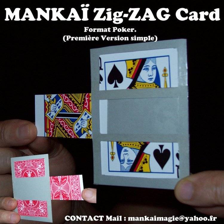 MANKAÏ Zig-ZAG Card Format Poker. (Première Version simple) Effet : Le magicien fait choisir une carte quelconque dans un jeu de cartes. Après avoir montré une enveloppe fenêtrée de tous ses cotés et même à l’intérieur, cette carte choisie est introduite à l’intérieur bien visiblement. Une passe magique, instantanément, la carte se trouve scindée en trois morceaux (ZigZaguée). Puis raccommodée. Bien entendu l'enveloppe vide et la carte sont données à l’examen. Ce tour a les avantages - D’utiliser un matériel simple : Une petite enveloppe et un jeu de cartes. - La présentation peut être directe avec la carte fournie avec le tour. - Ou suite au choix d’une carte dans un jeu normal et faisant partie d’une routine. - A la fin du tour carte et enveloppe peuvent être données à l’examen. Vidéo de l’effet, voir le lien ci-joint : Nouveau tour : Version exclusive de Mr .MANKAI Ezzedine mise au point le 07 décembre 2015 dans son format A4 et le 08 janvier 2016 dans son format Poker. Un nombre limité de 60 tours ont été construit et sont mis sur le marché. Le prix Unitaire est de 20 euros (avec l’envoie). CONTACT : Mail : mankaimagie@yahoo.fr