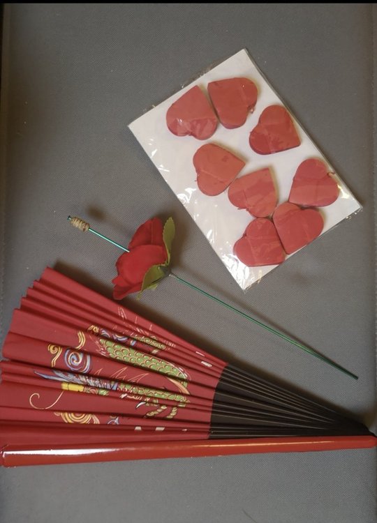 Lot composé d'un éventail Kung-fu rouge, d'une torche en rose, et d'une pochette de neige japonaise Cœurs rouges...
