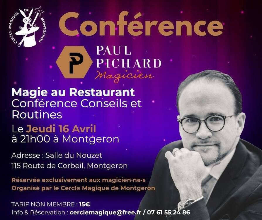 Le Cercle Magique de Montgeron ( 20 km au sud de Paris) aura le plaisir d'accueillir @Paul PICHARD (PaulMagie)en conférence, ce jeudi 16 avril à 20:30. Notre salle de rencontres, mise à disposition par la Municipalité dans le cadre de sa politique associative, a des capacités d'accueil limitées. Nous ne pourrons accueillir qu' une petite poignée d' "extérieurs". Réservation impérative auprès de Fabrice (au 07 61 55 24 86). Une participation de 15 euros sera demandée à l'entrée. Un buffet froid et des boissons sont inclus . -