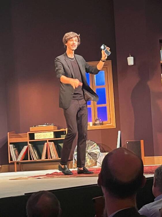 J'ai assisté à la première séance. Le cadre est assez intimiste : le Théatre de Paris est un "petit " théâtre (rien de péjoratif). A l'image de sa personnalité, David JARRE commence très modestement pour 2 représentations seulement. Il a derrière lui une longue carrière à l'étranger, justement pour échapper à l'étiquette "fils de..." ( mais vu la notoriété mondiale du paternel , difficile pour lui d'y échapper complètement). Le spectacle était aussi dans la salle. ça m'a fait bizarre d'être assis à quelques mètres de Jean Michel JARRE, accompagné de la mère de David JARRE : Charlotte RAMPLING. Bien que séparés de longue date, ils sont très soudés dès qu'il s'agit de leur fils, tous deux en extase devant leur progéniture. Il y avait aussi Michel DRUCKER, un ami très proche des JARRE, qui a provoqué un embouteillage pour la difficulté de monter les escaliers qui mènent à la salle à l'étage . Une petite salle bien remplie de proches de l'artiste venus en renfort le soutenir : c'était difficile pour David de solliciter des spectateurs qu'il ne connaissait pas... Le spectacle n'avait rien de très bluffant pour des spectateurs magiciens un peu aguerris, des classiques, mais qui passent bien : David JARRE a une personnalité attachante et ne se positionne pas en position de toute puissance. Un tour participatif avec les téléphones de chaque spectateur, présenté sur France 5 récemment, j'en ai profité pour prendre ce cliché. -