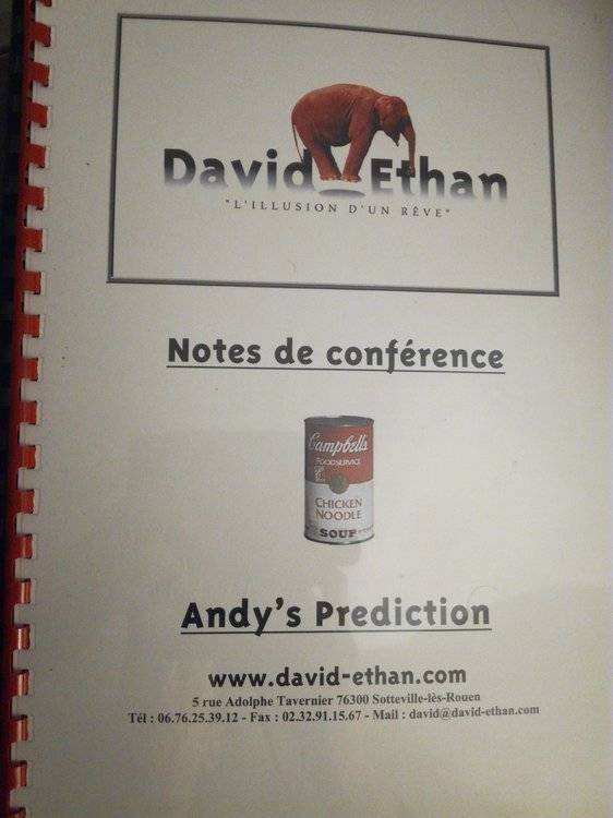Solo X - Andrew Mayne Andrew Mayne vous révèle 10 grandes Illusions toutes plus folles les unes que les autres ! Sommaire Cyclone: Vous avez sur scène une grande caisse ouverte sur le devant, à l'intérieur de laquelle 2 entonnoirs se font face. Vous prenez alors un compact dise et vous le placez entre les 2 entonnoirs. Vous invitez un spectateur à signer un ballon de basket. Vous prenez le ballon de basket et le faites passer au travers des entonnoirs et du compact dise. Lorsque le ballon ressort, demandez au spectateur de vérifier sa signature : il s'agit bien du même ballon. Dites alors : « Je sais à quoi vous pensez, vous pensez qu'il y a quelqu'un de caché derrière ou qu'il y a 2 ballons. Je vais vous prouver que vos 2 théories sont fausses ». Approchez-vous d'une des extrémités de la caisse, passez un bras dans un entonnoir, puis le corps entier et ressortez par l'autre entonnoir de l'autre côté. Triplex: Le magicien dévoile une cabine de petite taille. Il pénètre à l'intérieur par une porte située sur le dessus. Une fois dedans, il sort la tête par une porte placée au centre et ses mains ressortent par des trous percés à chaque extrémité. Son visage se fait grimaçant alors qu'il commence à se diviser en 3 morceaux. Ses mains et sa tête sont capables pourtant de bouger sur commande, en dépit des conditions. Shrinkboy: Introduisez dans votre spectacle la dernière découverte scientifique. Expliquez que l'on cherche l'économie partout, même pour les gens, afin qu'ils occupent moins d'espace et consomment moins. Offrez de présenter une démonstration au public. Montez dans un cadre, refermez la façade avant avec un store. Vos pieds, mains et tête émergent des trous percés dans la façade. En un mouvement rapide, le pieds et les mains se retrouvent proches les uns des autres au centre du cadre. Le public peut voir qu'il n'y a rien ni dessus, ni dessous. A frame: Le magicien offre au public une démonstration de ses capacités pour traverser des objets. Un grand miroir est amené sur scène et laissé à examiner pour montrer qu'il n'y a pas de trucage. Le miroir est placé à l'intérieur d'un rideau formant un grand « U » et le magicien se place derrière le rideau. Il place ses bras, un de chaque côté du miroir, attrape un rideau qui se trouve au pied du miroir et le remonte devant le miroir et devant lui. Le haut du miroir reste toujours visible, de même que les mains du magicien. L'instant d'après, le rideau est lâché et abaissé. Le magicien se retrouve devant le miroir. Blade runner: Créez un contexte de magie bizarre, comme pour introduire un thème de suicide rituel. Placez au centre de la scène une sorte de cabine qui va servir de « Machine de suicide symbolique ». Prenez place dans la cabine. Vos jambes et votre tête restent visibles pendant toute la démonstration. Expliquez que c'est une nouvelle façon de se repentir quand quelqu'un fait une erreur. Plusieurs épées sont dévoilées. Le magicien sort son bras gauche de la cabine et attrape l'une des épées. Il la plante dans une des fentes qui se trouvent sur la façade de la cabine. Il explique qu'il va ainsi continuer à se planter les épées une à une dans les parties vitales du corps jusqu'à ce que le pardon lui soit accordé. il explique que le pardon lui est finalement accordé, les épées sont retirées et le transgresseur lavé de tous démons. Techno Voodoo: Expliquez que l'un des plus gros problèmes dans le show-biz est d'éviter d'avoir la grosse tête et que vous allez montrer au public comment faire pour éviter cela. Présentez un tour qui fait appel à la technologie du XXIème siècle avec Voo-Do. Glissez la tête dans la machine, introduisez un certain nombre de baguettes. Ouvrez le panneau de façade, la tête du magicien apparaît rétrécie. Turbo: Un grand ventilateur industriel se trouve au centre de la scène. Le magicien le met en marche et des streamers s'agitent dans le souffle créé. Deux volets placés sur chaque côté du ventilateur sont fermés et ramenés devant le ventilateur. Les streamers qui ressortent par 4 fentes percées dans les angles des volets continuent à s'agiter. Une lumière est allumée à l'arrière du ventilateur et le mouvement de rotation du ventilateur peut être aperçu en ombre. Les extrémités des pales du ventilateur sont visibles à travers les fentes percées dans les volets. Le magicien prend une feuille de papier et grimpe derrière le ventilateur. Sa main émerge à l'avant du ventilateur. Quand il ouvre sa main, la feuille de papier est en confettis. Tout son corps traverse ensuite le ventilateur et le magicien ressort entre les volets. La lumière est éteinte, les volets sont ouverts révélant que le ventilateur tourne toujours. Zig zag: Le magicien amené sur scène une grande peinture. Il explique qu'elle doit lui ressembler un peu, car le peintre qui l'a faite était capable de comprendre ce qu'un magicien peut ressentir. Il le démontre en se plaçant derrière la peinture et en passant sa tête, ses mains et un pied dans les trous prévus dans la peinture. Le magicien fait coulisser sur le côté la partie de la peinture représentant son torse. Le panneau central décalé laisse voir au travers du corps du magicien (principe de la zigzag). Le magicien ramène ensuite le panneau central avec sa main droite et tout redevient normal. Box trick: Avant de savoir marcher, on sait ramper. Avant de savoir voler, il faut être capable de voler, voilà ce que le magicien explique. Amenez sur un chariot une poupée dans une boite en carton. Le magicien sort plusieurs choses de la boite et explique au public que la boite sert de chariot de lévitation. Il explique que léviter à l'intérieur de la boite évite de flotter trop haut. Il se propose de faire une démonstration et s'assied dans la boite. Il apparaît alors comme étant assis un peu au-dessus du plancher de la boite. Tv trick: Le magicien 
