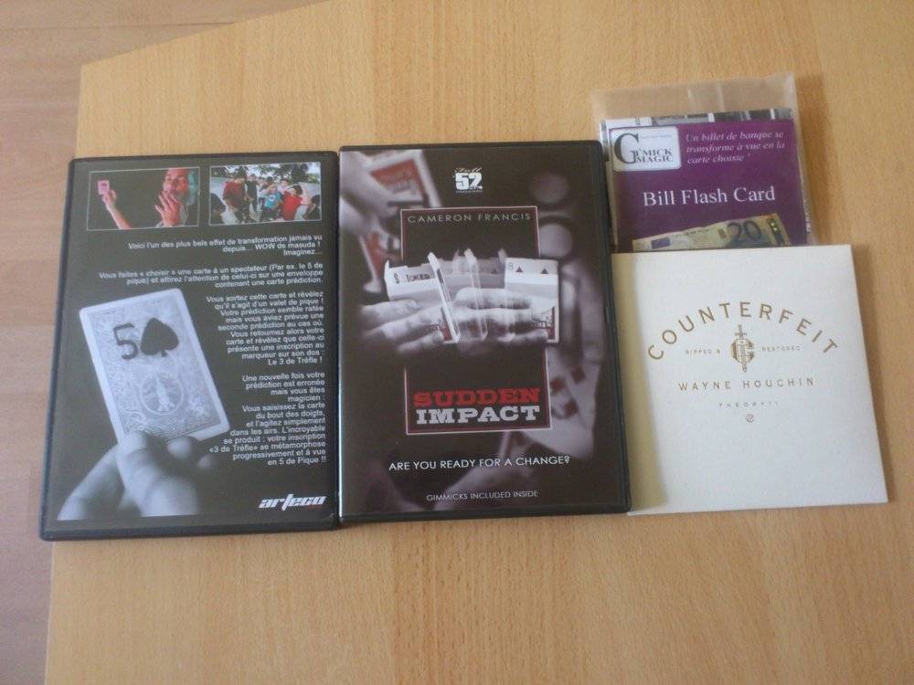 Un tour de magie à vendre en DVD "Counterfeit" Flow Ma GIc " neuf et emballé. Effet: Déchirez, brûlez, restaurez ! L'une des plus belles versions de cartes déchirée et restaurée qui soit, pratique et moderne, réalisable totalement entouré. Une création du fameux magicien et créateur américain Wayne Houchin. Tarif en magasin: 30 Euros. Vendu: 23 Euros. Comme dans tous les magasins, si vous désirez recevoir le tours par colis, vous devrez payer les frais qui se montent à 5,25 Euros. Remise en mains propres en Île-de-France en prenant un rendez-vous à l'avance. Vous pourrez me contacter par e-mail. Magicalement... Yannick Magic PS: ce tour est en photo avec trois autres... -