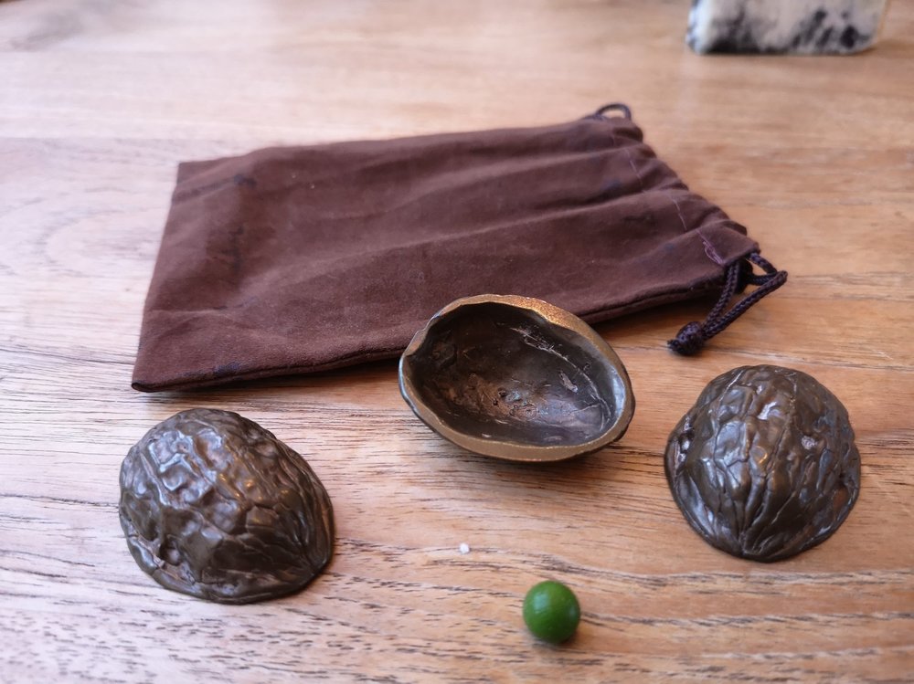 3 coquilles de noix en Bronze, belle état pas de coup, belle patiné. Fournis avec un perfect pea et sac. 40€ fdpi paypal