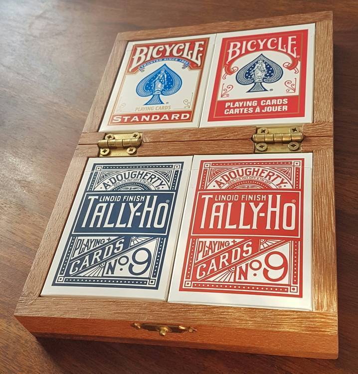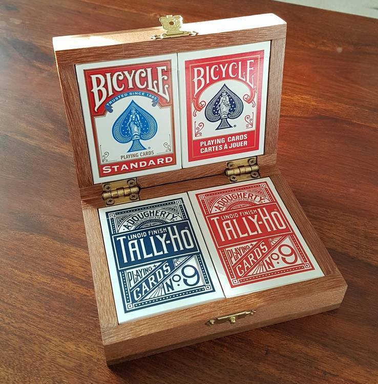 Bonjour, Je vends une boîte de collection pour ranger 4 paquets de cartes de format poker au prix de 180€, frais de port inclus. Il s'agit d'une pièce unique que j'avais faite faire sur mesure par un menuisier. Elle est faite en bois exotique d'acajou. L'épaisseur du bois est de 1 cm sur les faces latérales et de 0,8 cm sur les faces du haut et du bas. Je vous laisse imaginer débuter une routine en sortant votre jeu de cette boîte. Elle fait de l'effet. Avis aux professionnels. Je vous laisse admirer la beauté de la chose...