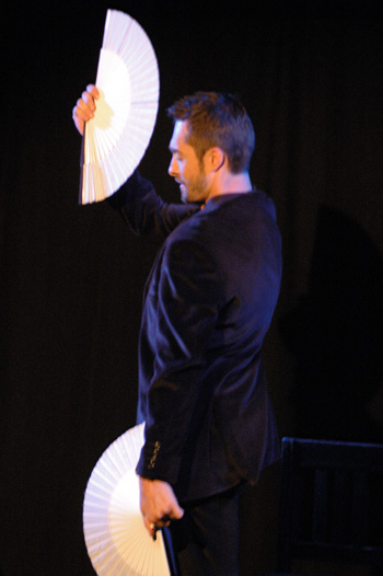 Gagnant de la place et de la lumière,”l’ombre orchestre” repris par Joseph production remplit une salle à sa mesure : un peu plus grande mais sans excès, juste adaptée au format de ce spectacle visuel. Peu de changements à ce numéro qui n’en a pas vraiment besoin, un Xavier maîtrisant mieux sa technique ce qui donnera davantage d’aisance au personnage. Les jongleries de pièces façon Pierre BRAHMA égalent, voire dépassent le maître : un jet accordéon par dessus l’épaule, et hop ! Xavier MORTIMER rattrape le tout sans frémir, jolie cascade.